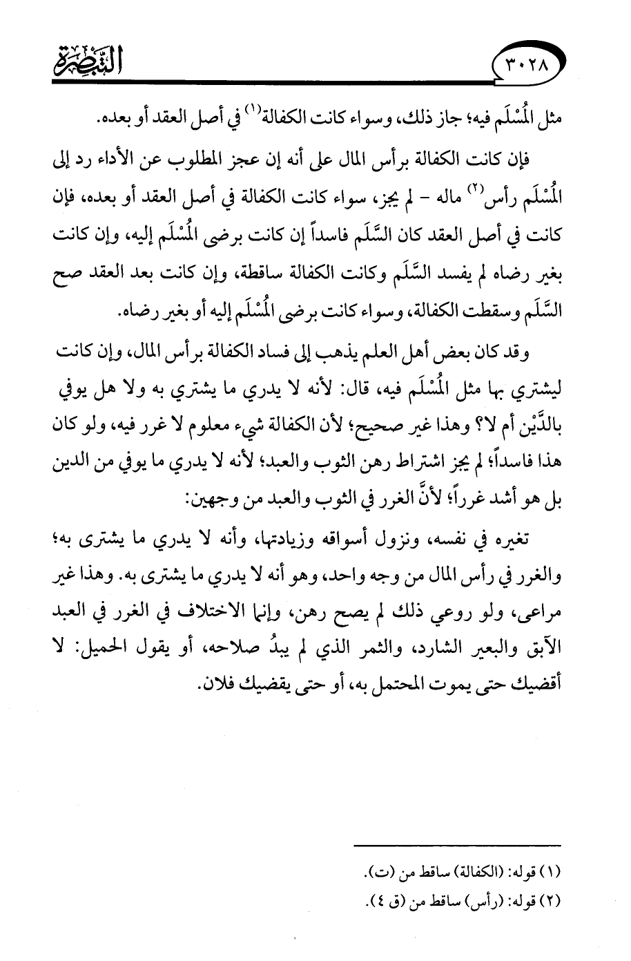 وقد كان بعض أهل العلم يذهب إلى فساد الكفالة برأس المال، وإن كانت ليشتري بها مثل المُسْلَم فيه، قال: لأنه لا يدري ما يشتري به ولا هل يوفي بالدَّيْن أم لا؟ وهذا غير صحيح؛ لأن الكفالة شيء معلوم لا غرر فيه، ولو كان هذا فاسدًا، لم يجز اشتراط رهن الثوب والعبد؛ لأنه لا يدري ما يوفي من الدين بل هو أشد غررًا؛ لأنَّ الغرر في الثوب والعبد من وجهين:
