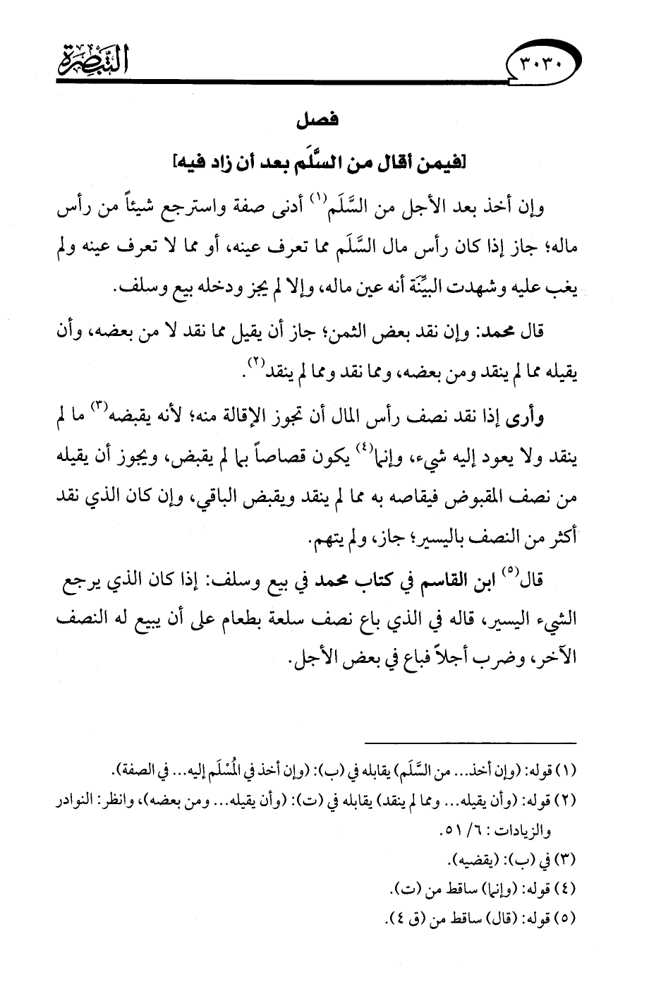 (¬2) قوله: (وأن يقيله. . . ومما لم ينقد) يقابله في (ت): (وأن يقيله. . . ومن بعضه)، وانظر: النوادر والزيادات: 6/ 51.