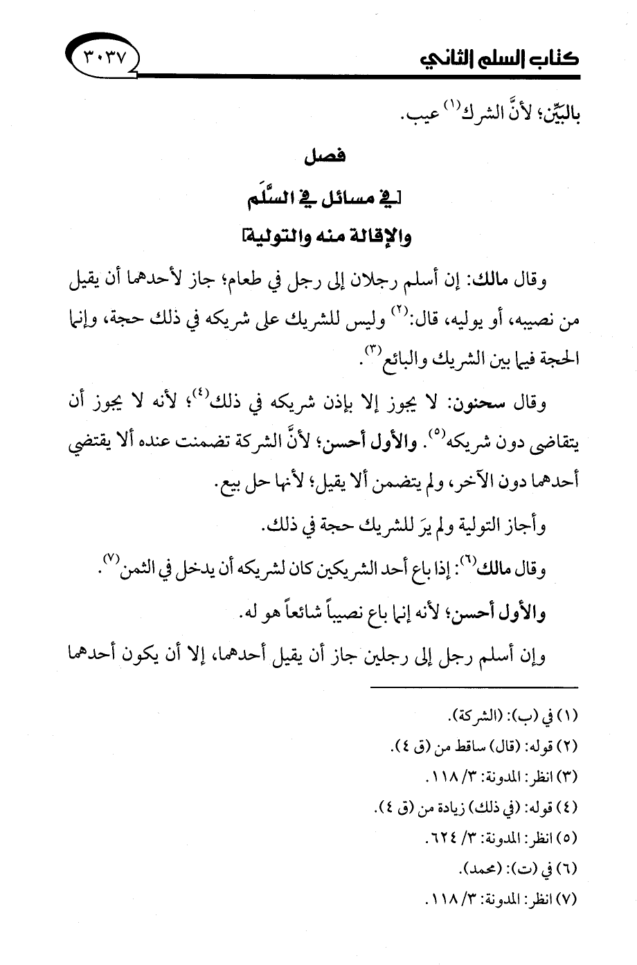 وقال سحنون: لا يجوز إلا بإذن شريكه في ذلك (¬4)؛ لأنه لا يجوز أن يتقاضى دون شريكه (¬5). والأول أحسن؛ لأنَّ الشركة تضمنت عنده ألا يقتضي أحدهما دون الآخر، ولم يتضمن ألا يقيل؛ لأنها حل بيع.