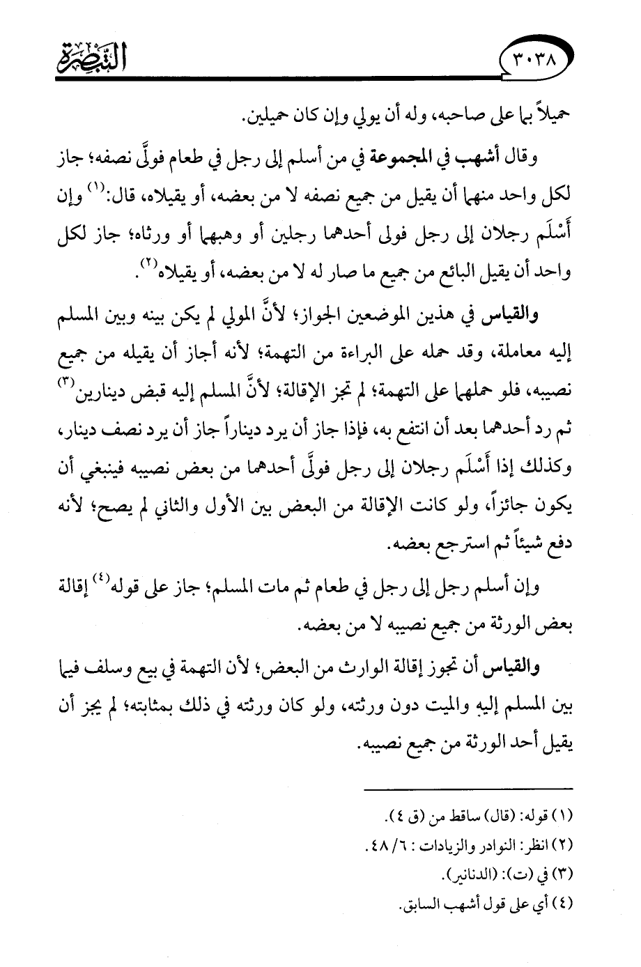 والقياس في هذين الموضعين الجواز؛ لأنَّ المولي لم يكن بينه وبين المسلم إليه معاملة، وقد حمله على البراءة من التهمة؛ لأنه أجاز أن يقيله من جميع نصيبه، فلو حملهما على التهمة، لم تجز الإقالة؛ لأنَّ المسلم إليه قبض دينارين (¬3) ثم رد أحدهما بعد أن انتفع به، فإذا جاز أن يرد دينارًا جاز أن يرد نصف دينار، وكذلك إذا أَسْلَم رجلان إلى رجل فولَّى أحدهما من بعض نصيبه فينبغي أن يكون جائزًا، ولو كانت الإقالة من البعض بين الأول والثاني لم يصح؛ لأنه دفع شيئًا ثم استرجع بعضه.