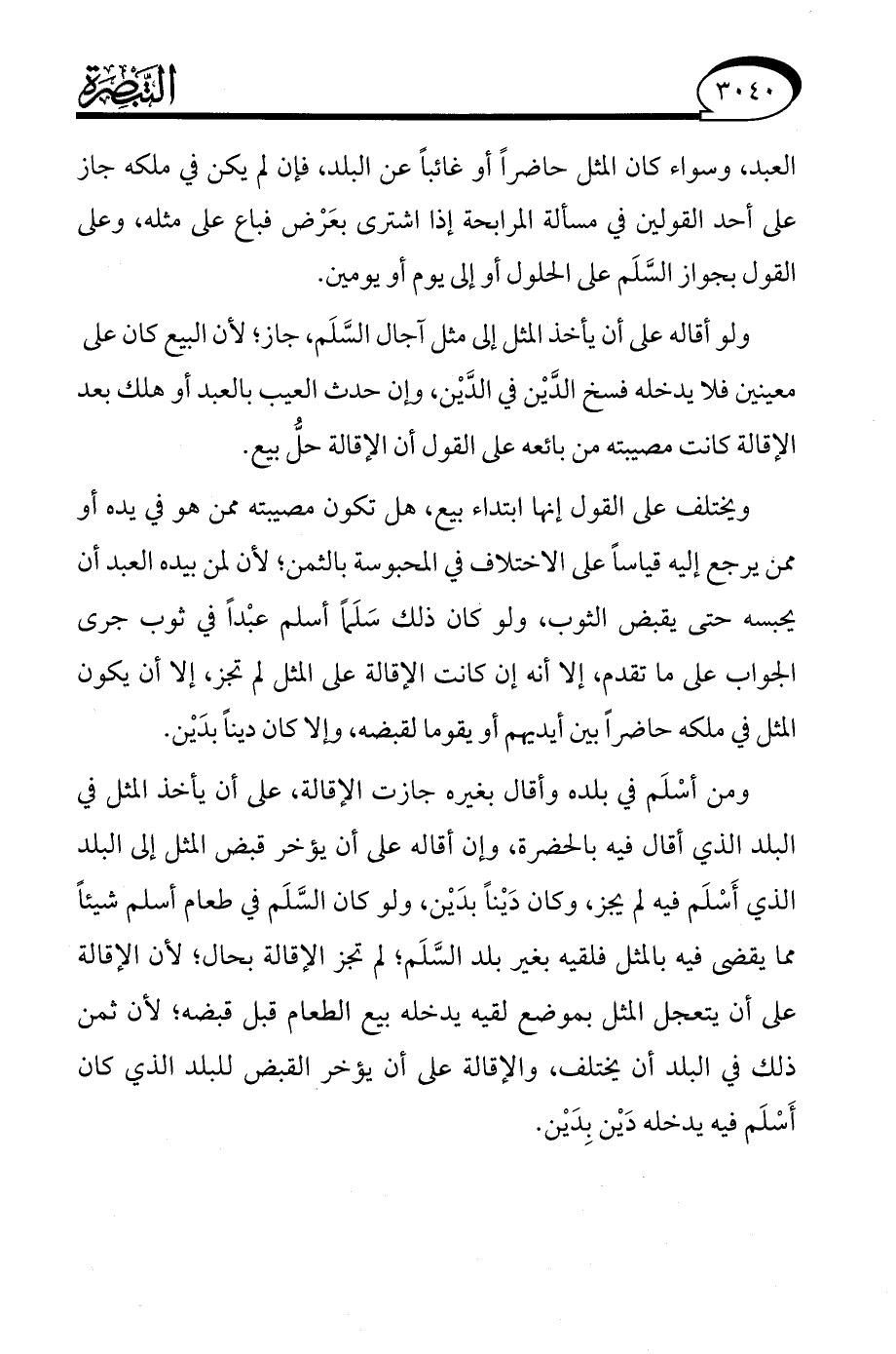 ويختلف على القول إنها ابتداء بيع، هل تكون مصيبته ممن هو في يده أو ممن يرجع إليه قياسًا على الاختلاف في المحبوسة بالثمن؛ لأن لمن بيده العبد أن يحبسه حتى يقبض الثوب، ولو كان ذلك سَلَمًا أسلم عبْدًا في ثوب جرى الجواب على ما تقدم، إلا أنه إن كانت الإقالة على المثل لم تجز، إلا أن يكون المثل في ملكه حاضرًا بين أيديهم أو يقوما لقبضه، وإلا كان دينًا بدَيْن.