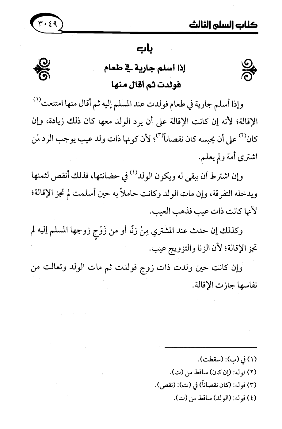 وإذا أسلم جارية في طعام فولدت عند المسلم إليه ثم أقال منها امتنعت (¬1) الإقالة؛ لأنه إن كانت الإقالة على أن يرد الولد معها كان ذلك زيادة، وإن كان (¬2) على أن يحبسه كان نقصانًا (¬3)؛ لأن كونها ذات ولد عيب يوجب الرد لمن اشترى أمة ولم يعلم.