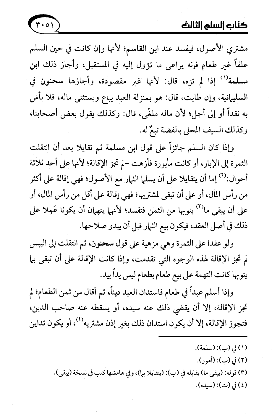 وإذا كان السلم جائزًا على قول ابن مسلمة ثم تقايلا بعد أن انتقلت الثمرة إلى الإبار، أو كانت مأبورة فأزهت- لم تجز الإقالة؛ لأنها على أحد ثلاثة أحوال: (¬2) إما أن يتقايلا على أن يسلما الثمار مع الأصول، فهي إقالة على أكثر من رأس المال، أو على أن تبقى لمشتريها، فهي إقالة على أقل من رأس المال، أو على أن يبقى ما (¬3) ينوبها من الثمن فتفسد؛ لأنهما يتهمان أن يكونا عَمِلا على ذلك في أصل العقد، فيكون بيع الثمار قبل أن يبدو صلاحها.