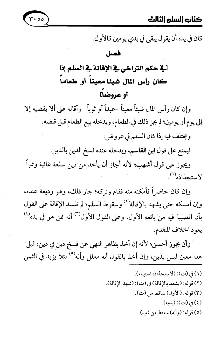 فصل [في حكم التراخي في الإقالة في السلم إذا كان رأس المال شيئا معينًا أو طعامًا أو عروضًا]