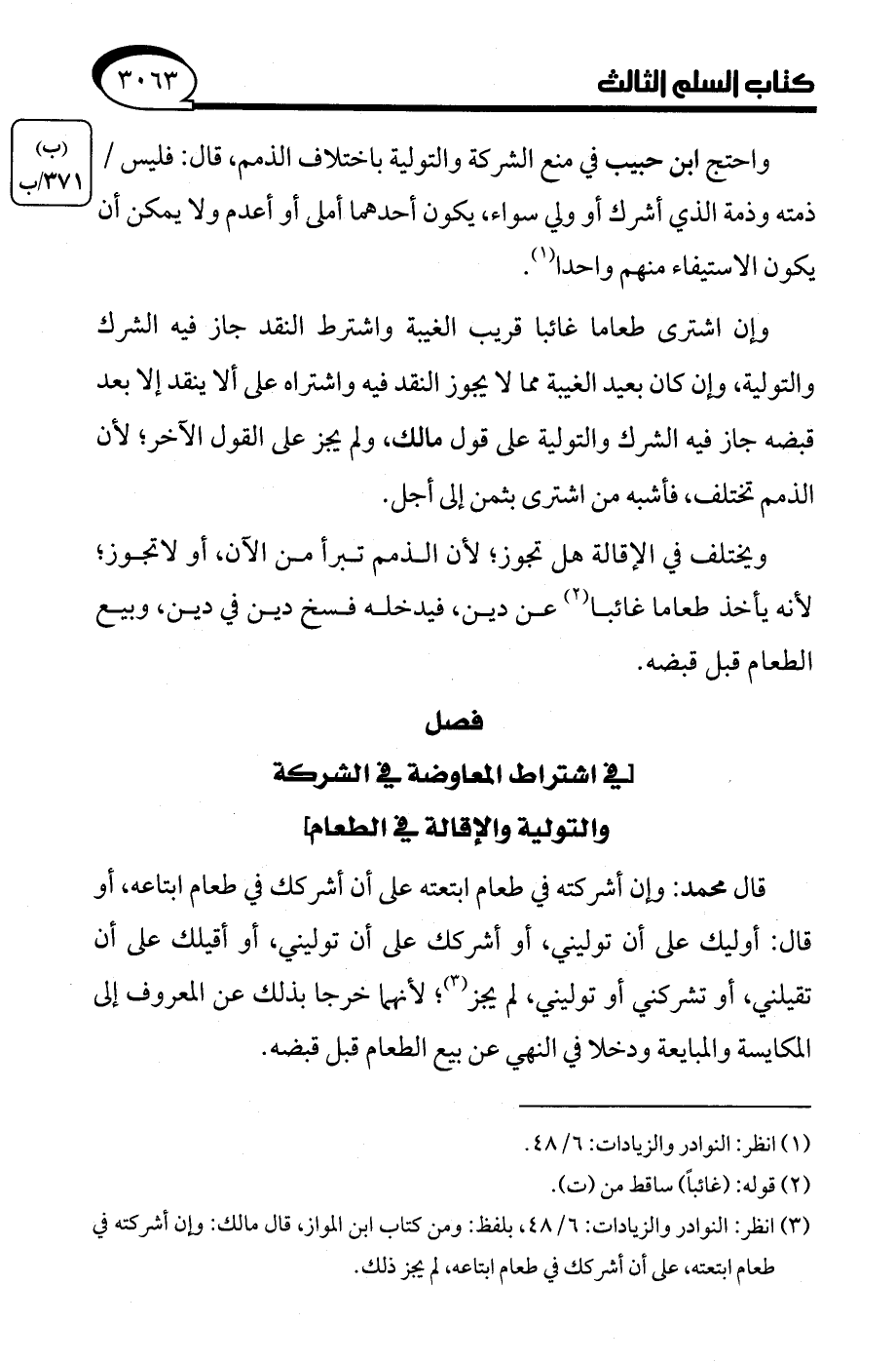 (¬3) انظر: النوادر والزيادات: 6/ 48، بلفظ: ومن كتاب ابن المواز، قال مالك: وإن أشركته في طعام ابتعته، على أن أشركك في طعام ابتاعه، لم يجز ذلك.