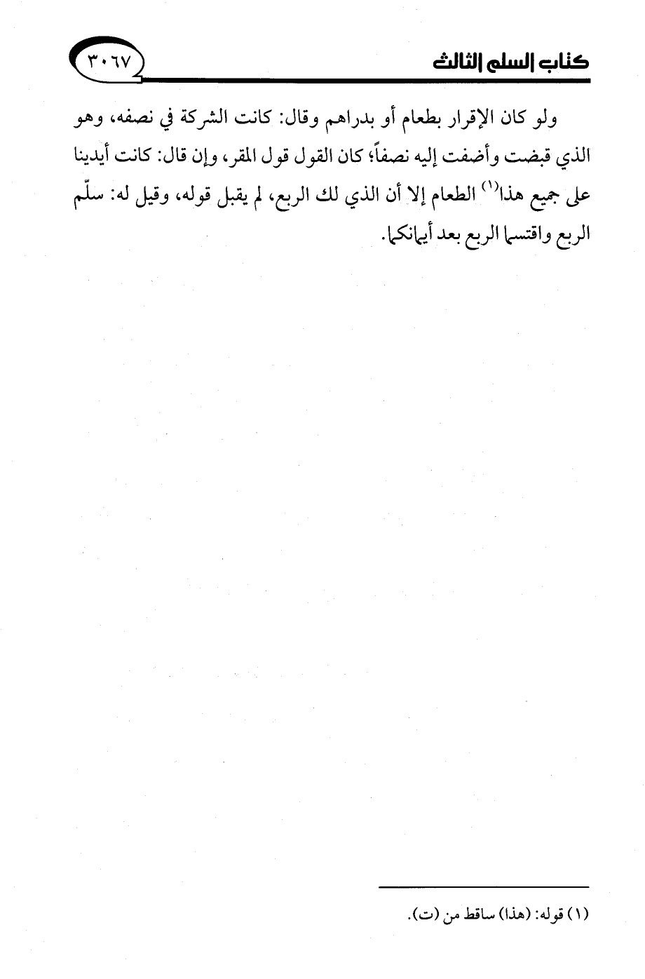 ولو كان الإقرار بطعام أو بدراهم وقال: كانت الشركة في نصفه، وهو الذي قبضت وأضفت إليه نصفًا، كان القول قول المقر، وإن قال: كانت أيدينا على جميع هذا (¬1) الطعام إلا أن الذي لك الربع، لم يقبل قوله، وقيل له: سلّم الربع واقتسما الربع بعد أيمانكما.