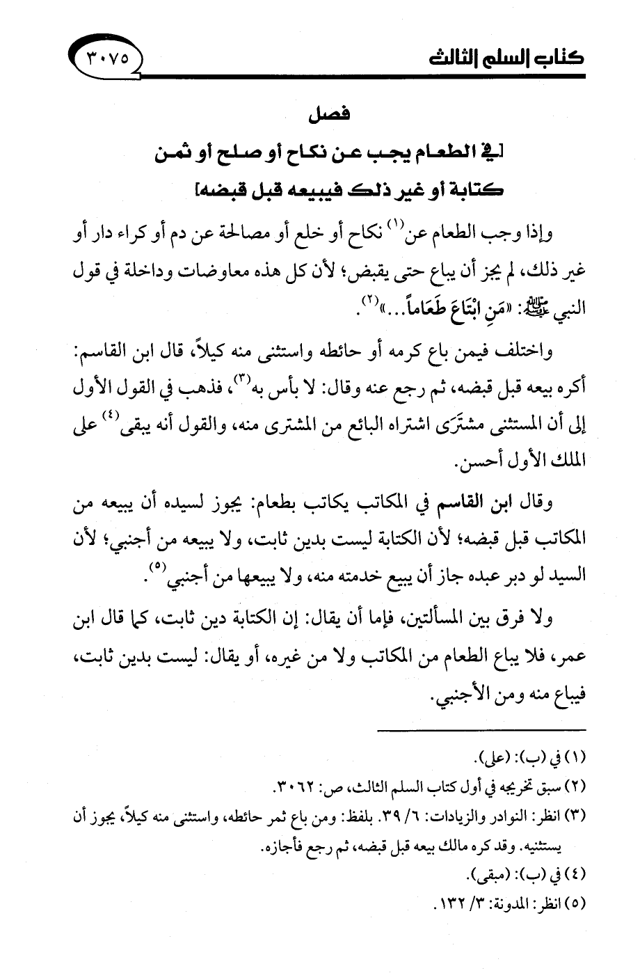 (¬3) انظر: النوادر والزيادات: 6/ 39. بلفظ: ومن باع ثمر حائطه، واستثنى منه كيلًا، يجوز أن يستثنيه. وقد كره مالك بيعه قبل قبضه، ثم رجع فأجازه.