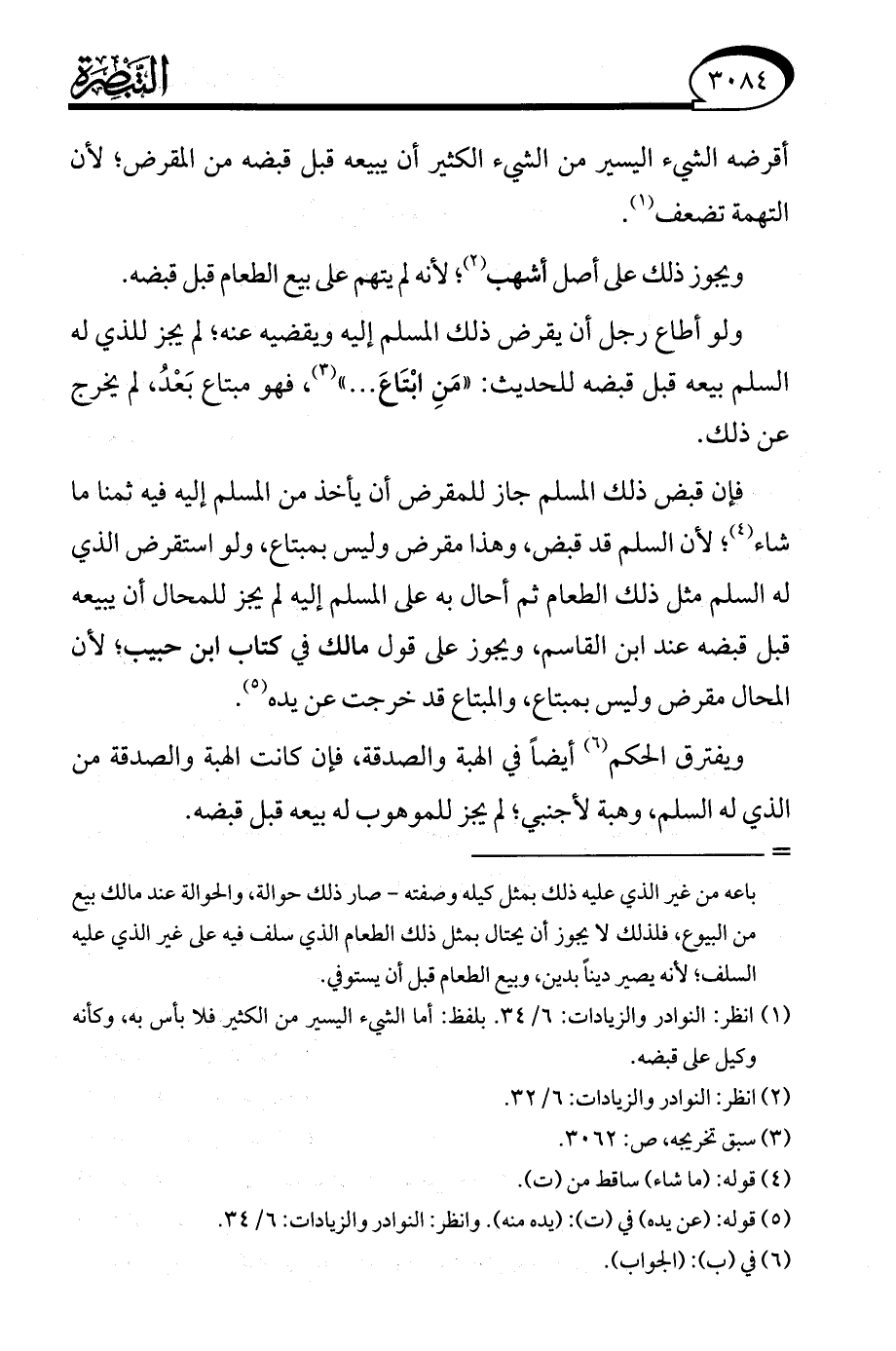 (¬1) انظر: النوادر والزيادات: 6/ 34. بلفظ: أما الشيء اليسير من الكثير فلا بأس به، وكأنه وكيل على قبضه.