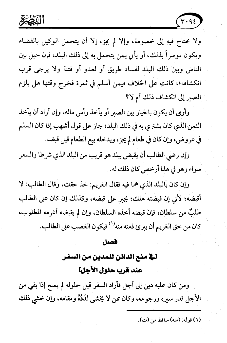 ولا يحتاج فيه إلى خصومة، وإلا لم يجز، إلا أن يتحمل الوكيل بالقضاء ويكون موسرًا بذلك، أو يأتي بمن يتحمل به إلى ذلك البلد، فإن حيل بين الناس وبين ذلك البلد لفساد طريق أو لعدو أو فتنة ولا يرجى قرب انكشافه، كانت على الخلاف فيمن أسلم في ثمرة فخرج وقتها هل يلزم الصبر إلى انكشاف ذلك أم لا؟