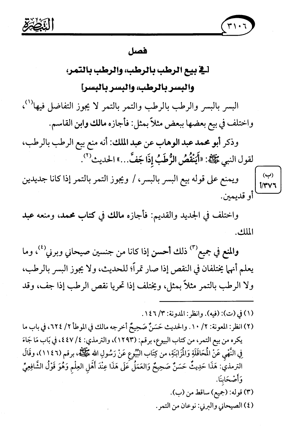 والمنع في جميع (¬3) ذلك أحسن إذا كانا من جنسين صيحاني وبرني (¬4)، وما يعلم أنهما يختلفان في النقص إذا صار تمرًا، للحديث، ولا يجوز البسر بالرطب، ولا الرطب بالتمر مثلًا بمثل، ويختلف إذا تحريا نقص الرطب إذا جف، وقد