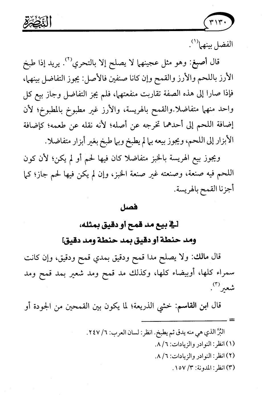 قال أصبغ: وهو مثل عجينهما لا يصلح إلا بالتحري (¬2). يريد إذا طبخ الأرز باللحم والأرز والقمح وإن كانا صنفين فالأصل: يجوز التفاضل بينهما، فإذا صارا إلى هذه الصفة تقاربت منفعتهما، فلم يجز التفاضل وجاز بيع كل واحد منهما متفاضلا. والقمح بالهريسة، والأرز غير مطبوخ بالمطبوخ؛ لأن إضافة اللحم إلى أحدهما تخرجه عن أصله؛ لأنه نقله عن طعمه، كإضافة الأبزار إلى اللحم، ويجوز بيعه بما لم يطبخ وبما طبخ بغير أبزار متفاضلا.