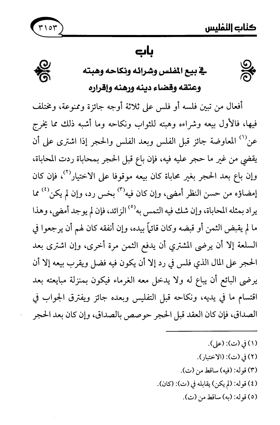 أفعال من تبين فلسه أو فلس على ثلاثة أوجه جائزة وممنوعة، ومختلف فيها، فالأول بيعه وشراءه وهبته للثواب ونكاحه وما أشبه ذلك مما يخرج عن (¬1) المعاوضة جائز قبل الفلس وبعد الفلس والحجر إذا اشترى على أن يقضي من غير ما حجر عليه فيه، فإن باع قبل الحجر بمحاباة ردت المحاباة، وإن باع بعد الحجر بغير محاباة كان بيعه موقوفا على الاختيار (¬2)، فإن كان إمضاؤه من حسن النظر أمضى، وإن كان فيه (¬3) بخس رد، وإن لم يكن (¬4) مما يراد بمثله المحاباة، وإن شك فيه التمس به (¬5) الزائد، فإن لم يوجد أمضى، وهذا ما لم يقبض الثمن أو قبضه وكان قائمًا بيده، وإن أنفقه كان لهم أن يرجعوا في السلعة إلا أن يرضى المشتري أن يدفع الثمن مرة أخرى، وإن اشترى بعد الحجر على المال الذي فلس في رد إلا أن يكون فيه فضل ويقرب بيعه إلا أن يرضى البائع أن يباع له ولا يدخل معه الغرماء فيكون بمنزلة مبايعته بعد اقتسام ما في يديه، ونكاحه قبل التفليس وبعده جائز ويفترق الجواب في الصداق، فإن كان العقد قبل الحجر حوصص بالصداق، وإن كان بعد الحجر