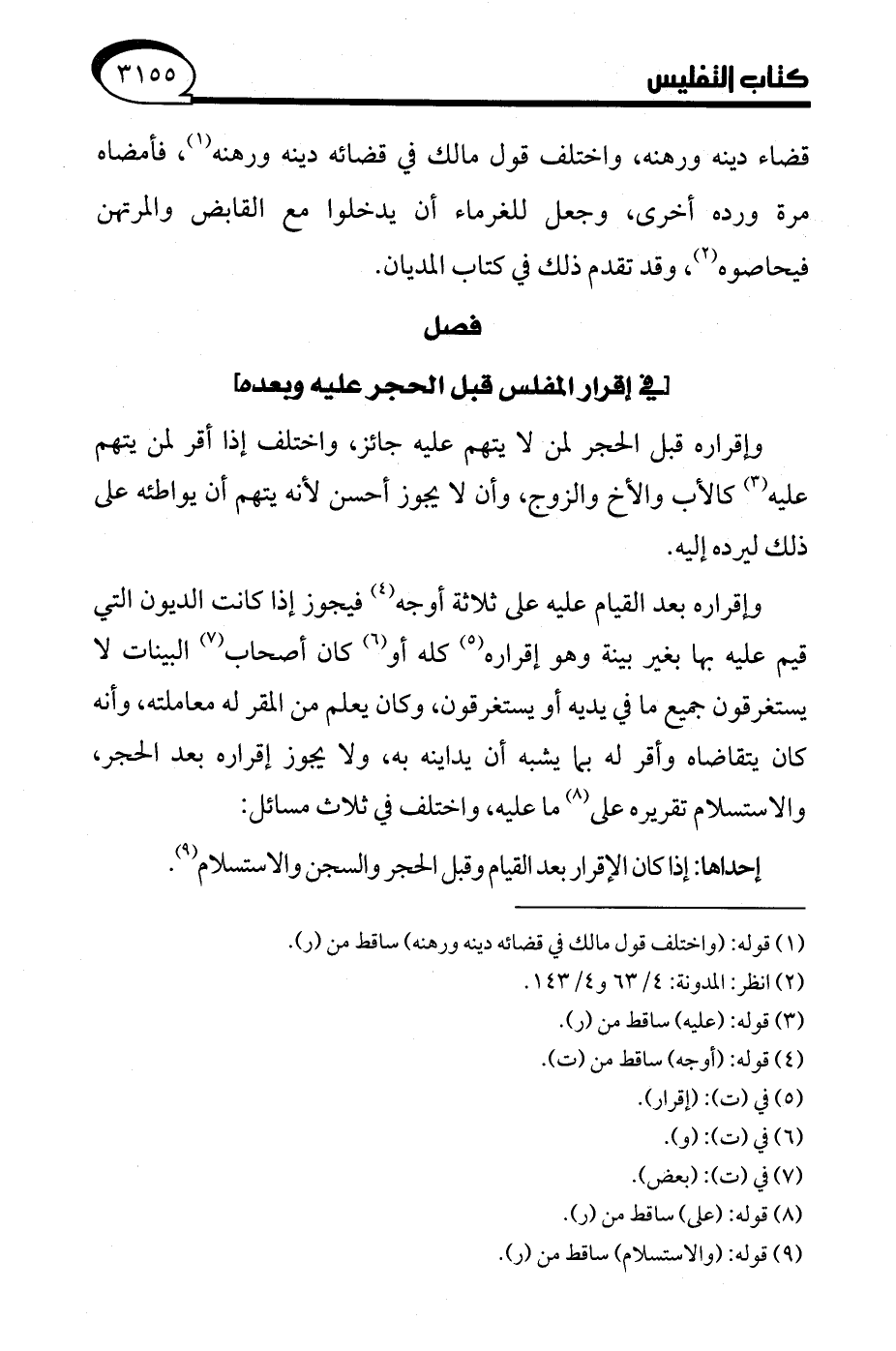 وإقراره بعد القيام عليه على ثلاثة أوجه (¬4) فيجوز إذا كانت الديون التي قيم عليه بها بغير بينة وهو إقراره (¬5) كله أو (¬6) كان أصحاب (¬7) البينات لا يستغرقون جميع ما في يديه أو يستغرقون، وكان يعلم من المقر له معاملته، وأنه كان يتقاضاه وأقر له بما يشبه أن يداينه به، ولا يجوز إقراره بعد الحجر، والاستسلام تقريره على (¬8) ما عليه، واختلف في ثلاث مسائل: