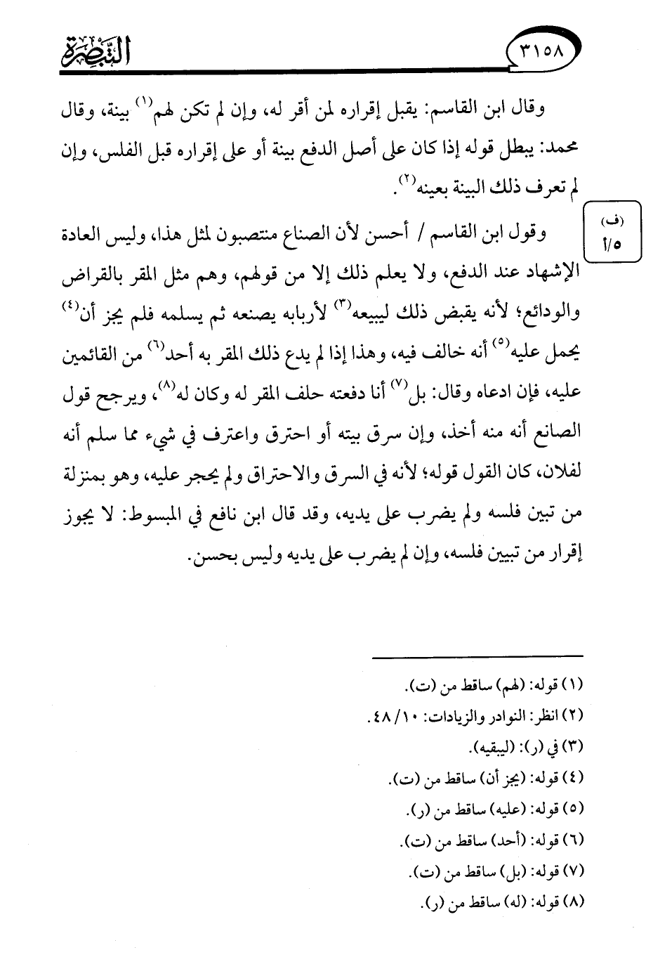 وقول ابن القاسم أحسن لأن الصناع منتصبون لمثل هذا، وليس العادة الإشهاد عند الدفع، ولا يعلم ذلك إلا من قولهم، وهم مثل المقر بالقراض والودائع؛ لأنه يقبض ذلك ليبيعه (¬3) لأربابه يصنعه ثم يسلمه فلم يجز أن (¬4) يحمل عليه (¬5) أنه خالف فيه، وهذا إذا لم يدع ذلك المقر به أحد (¬6) من القائمين عليه، فإن ادعاه وقال: بل (¬7) أنا دفعته حلف المقر له وكان له (¬8)، ويرجح قول الصانع أنه منه أخذ، وإن سرق بيته أو احترق واعترف في شيء مما سلم أنه لفلان، كان القول قوله؛ لأنه في السرق والاحتراق ولم يحجر عليه، وهو بمنزلة من تبين فلسه ولم يضرب على يديه، وقد قال ابن نافع في المبسوط: لا يجوز إقرار من تبيين فلسه، وإن لم يضرب على يديه وليس بحسن.