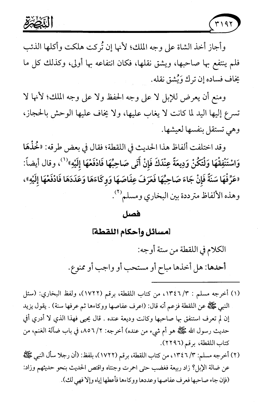 (¬1) أخرجه مسلم: 3/ 1346، من كتاب اللقطة، برقم (1722)، ولفظ البخاري: (سئل النبي - صلى الله عليه وسلم - عن اللقطة فزعم أنه قال: (اعرف عفاصها ووكاءها ثم عرفها سنة). يقول يزيد إن لم تعرف استنفق بها صاحبها وكانت وديعة عنده. قال يحيى فهذا الذي لا أدري أفي حديث رسول الله - صلى الله عليه وسلم - هو أم شيء من عنده) أخرجه: 2/ 856، في باب ضآلة الغنم، من كتاب اللقطة، برقم (2296).