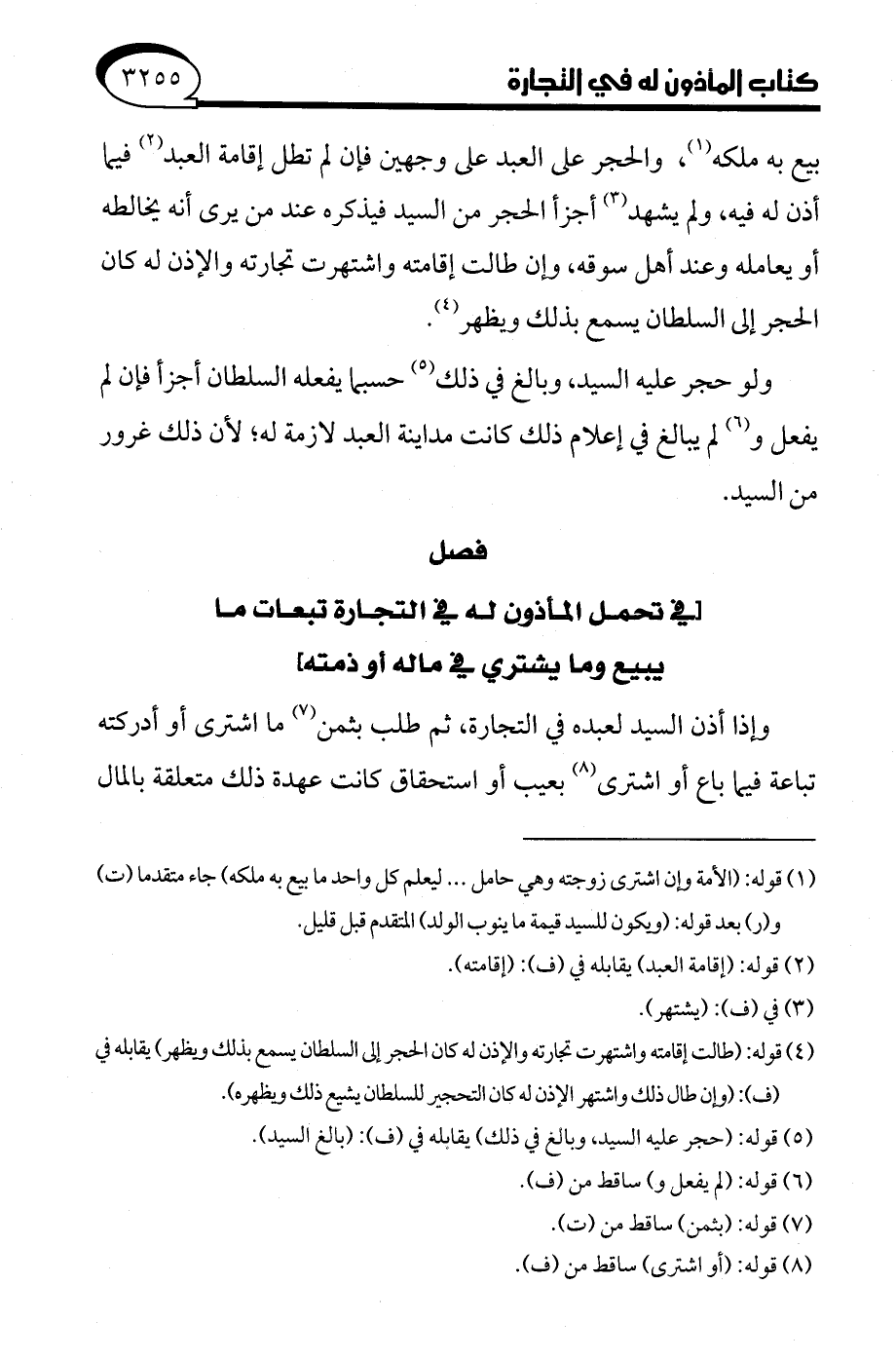 (¬4) قوله: (طالت إقامته واشتهرت تجارته والإذن له كان الحجر بلى السلطان يسمع بذلك ويظهر) يقابله في (ف): (وإن طال ذلك واشتهر الإذن له كان التحجير للسلطان يشيع ذلك ويظهره).