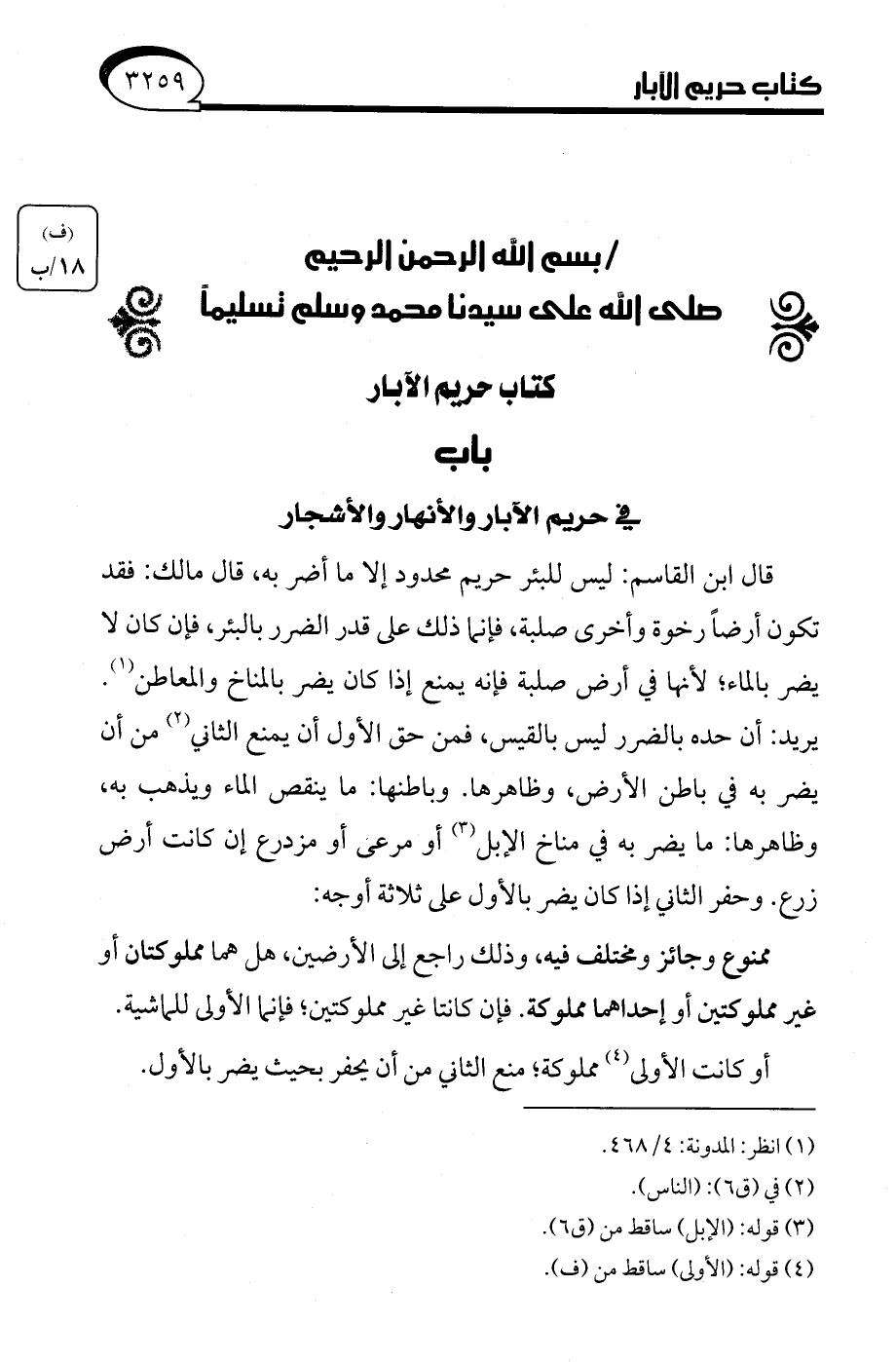 قال ابن القاسم: ليس للبئر حريم محدود إلا ما أضر به، قال مالك: فقد تكون أرضًا رخوة وأخرى صلبة، فإنما ذلك على قدر الضرر بالبئر، فإن كان لا يضر بالماء؛ لأنها في أرض صلبة فإنه يمنع إذا كان يضر بالمناخ والمعاطن (¬1). يريد: أن حده بالضرر ليس بالقيس، فمن حق الأول أن يمنع الثاني (¬2) من أن يضر به في باطن الأرض، وظاهرها. وباطنها: ما ينقص الماء ويذهب به، وظاهرها: ما يضر به في مناخ الإبل (¬3) أو مرعى أو مزدرع إن كانت أرض زرع. وحفر الثاني إذا كان يضر بالأول على ثلاثة أوجه: