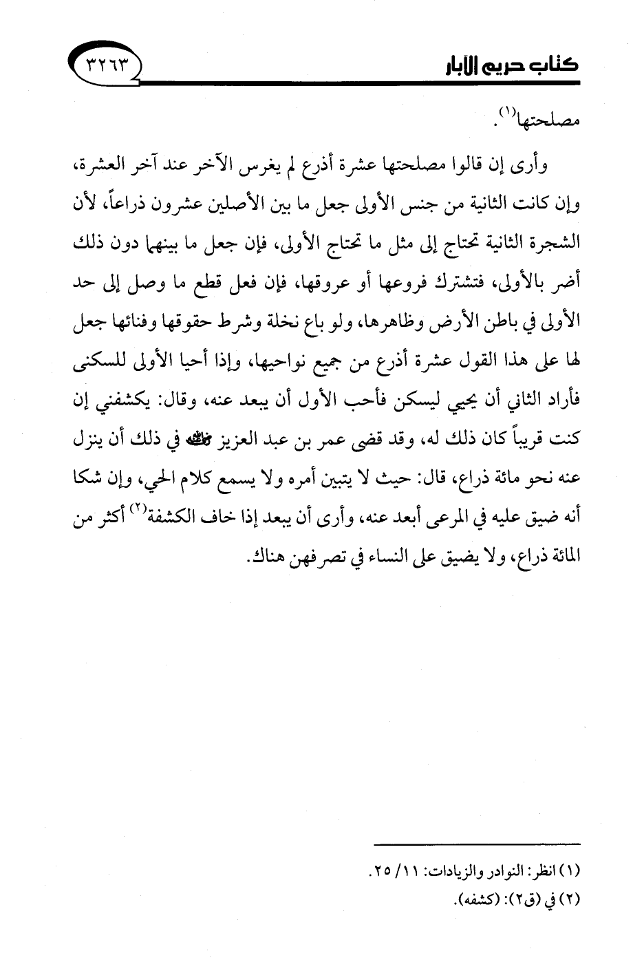 وأرى إن قالوا مصلحتها عشرة أذرع لم يغرس الآخر عند آخر العشرة، وإن كانت الثانية من جنس الأولى جعل ما بين الأصلين عشرون ذراعًا؛ لأن الشجرة الثانية تحتاج إلى مثل ما تحتاج الأولى، فإن جعل ما بينهما دون ذلك أضر بالأولى، فتشترك فروعها أو عروقها، فإن فعل قطع ما وصل إلى حد الأولى في باطن الأرض وظاهرها، ولو باع نخلة وشرط حقوقها وفنائها جعل لها على هذا القول عشرة أذرع من جميع نواحيها، وإذا أحيا الأولى للسكنى فأراد الثاني أن يحيي ليسكن فأحب الأول أن يبعد عنه، وقال: يكشفني إن كنت قريبًا كان ذلك له، وقد قضى عمر بن عبد العزيز - رضي الله عنه - في ذلك أن ينزل عنه نحو مائة ذراع، قال: حيث لا يتبين أمره ولا يسمع كلام الحي، وإن شكا أنه ضيق عليه في المرعى أبعد عنه، وأرى أن يبعد إذا خاف الكشفة (¬2) أكثر من المائة ذراع، ولا يضيق على النساء في تصرفهن هناك.