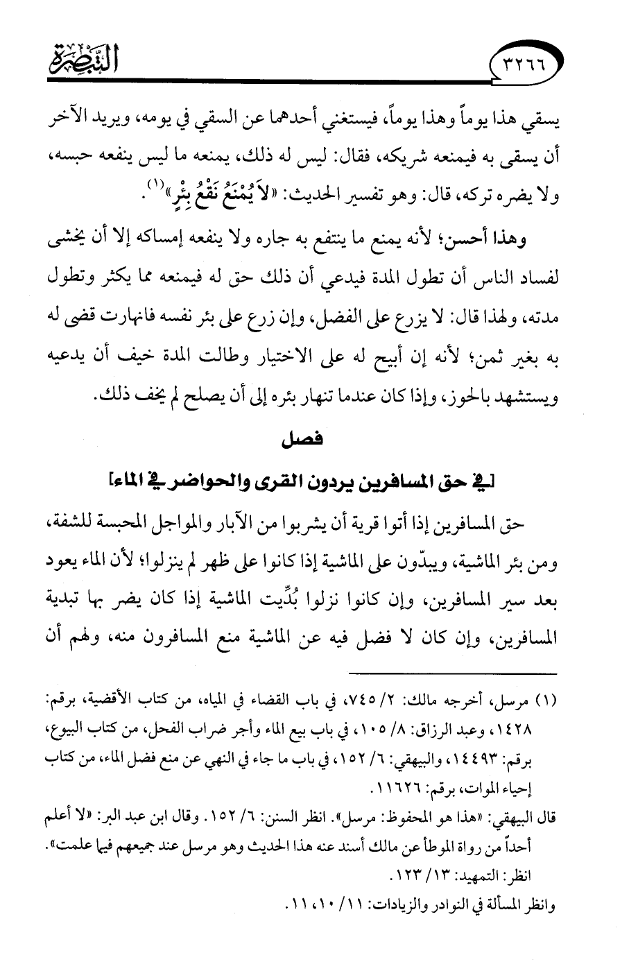 (¬1) مرسل، أخرجه مالك: 2/ 745، في باب القضاء في المياه، من كتاب الأقضية، برقم: 1428، وعبد الرزاق: 8/ 105، في باب بيع الماء وأجر ضراب الفحل، من كتاب البيوع، برقم: 14493، والبيهقي: 6/ 152، في باب ما جاء في النهي عن منع فضل الماء، من كتاب إحياء الموات، برقم: 11626.