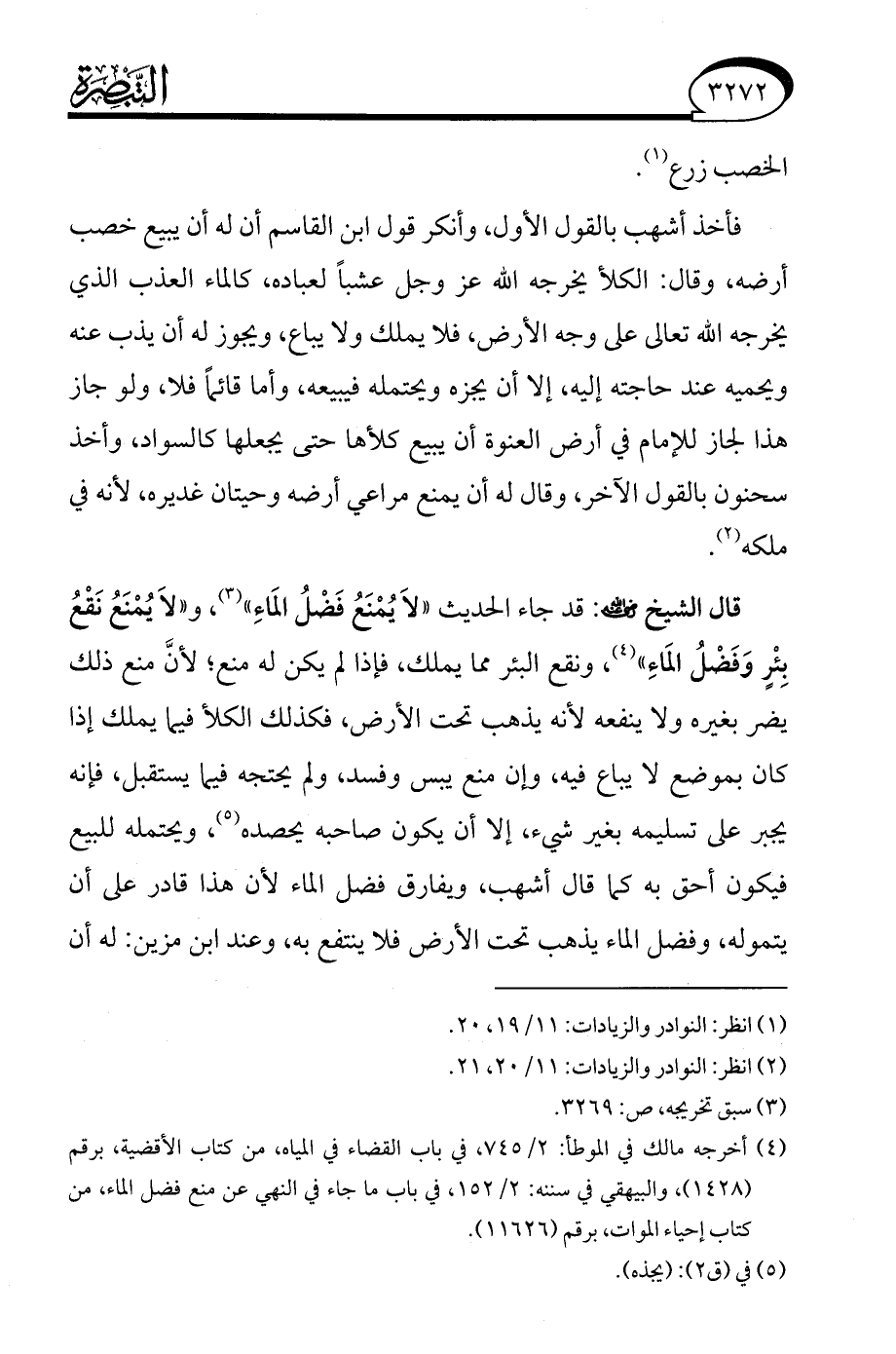 قال الشيخ - رضي الله عنه -: قد جاء الحديث "لَا يُمْنَعُ فَضْلُ المَاءِ" (¬3)، و"لاَ يُمْنَعُ نَقْعُ بِئْرٍ وَفَضْلُ المَاءِ" (¬4)، ونقع البئر مما يملك، فإذا لم يكن له منع؛ لأنَّ منع ذلك يضر بغيره ولا ينفعه لأنه يذهب تحت الأرض، فكذلك الكلأ فيما يملك إذا كان بموضع لا يباع فيه، وإن منع يبس وفسد، ولم يحتجه فيما يستقبل، فإنه يجبر على تسليمه بغير شيء، إلا أن يكون صاحبه يحصده (¬5)، ويحتمله للبيع فيكون أحق به كما قال أشهب، ويفارق فضل الماء لأن هذا قادر على أن يتموله، وفضل الماء يذهب تحت الأرض فلا ينتفع به، وعند ابن مزين: له أن