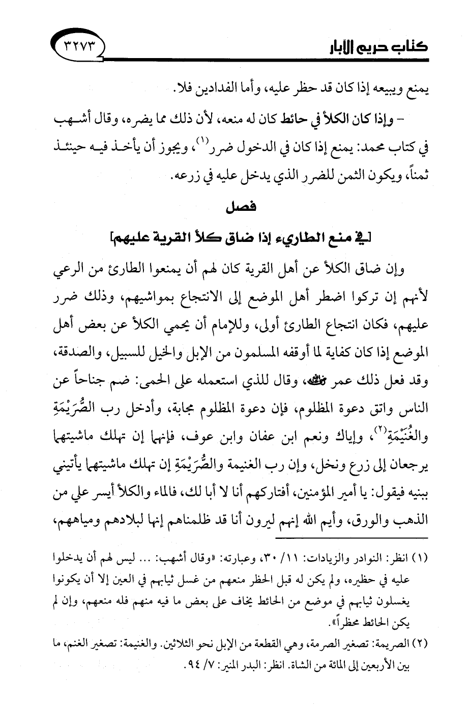 وإن ضاق الكلأ عن أهل القرية كان لهم أن يمنعوا الطارئ من الرعي لأنهم إن تركوا اضطر أهل الموضع إلى الانتجاع بمواشيهم، وذلك ضرر عليهم، فكان انتجاع الطارئ أولى، وللإمام أن يحمي الكلأ عن بعض أهل الموضع إذا كان كفاية لما أوقفه المسلمون من الإبل والخيل للسبيل، والصدقة، وقد فعل ذلك عمر - رضي الله عنه -، وقال للذي استعمله على الحمى: ضم جناحًا عن الناس واتق دعوة المظلوم، فإن دعوة المظلوم مجابة، وأدخل رب الصُّرَيْمَةِ والغُنَيْمَةِ (¬2)، وإياك ونعم ابن عفان وابن عوف، فإنهما إن تهلك ماشيتهما يرجعان إلى زرع ونخل، وإن رب الغنيمة والصُّرَيْمَةِ إن تهلك ماشيتهما يأتيني ببنيه فيقول: يا أمير المؤمنين، أفتاركهم أنا لا أبا لك، فالماء والكلأ أيسر علي من الذهب والورق، وأيم الله إنهم ليرون أنا قد ظلمناهم إنها لبلادهم ومياههم،