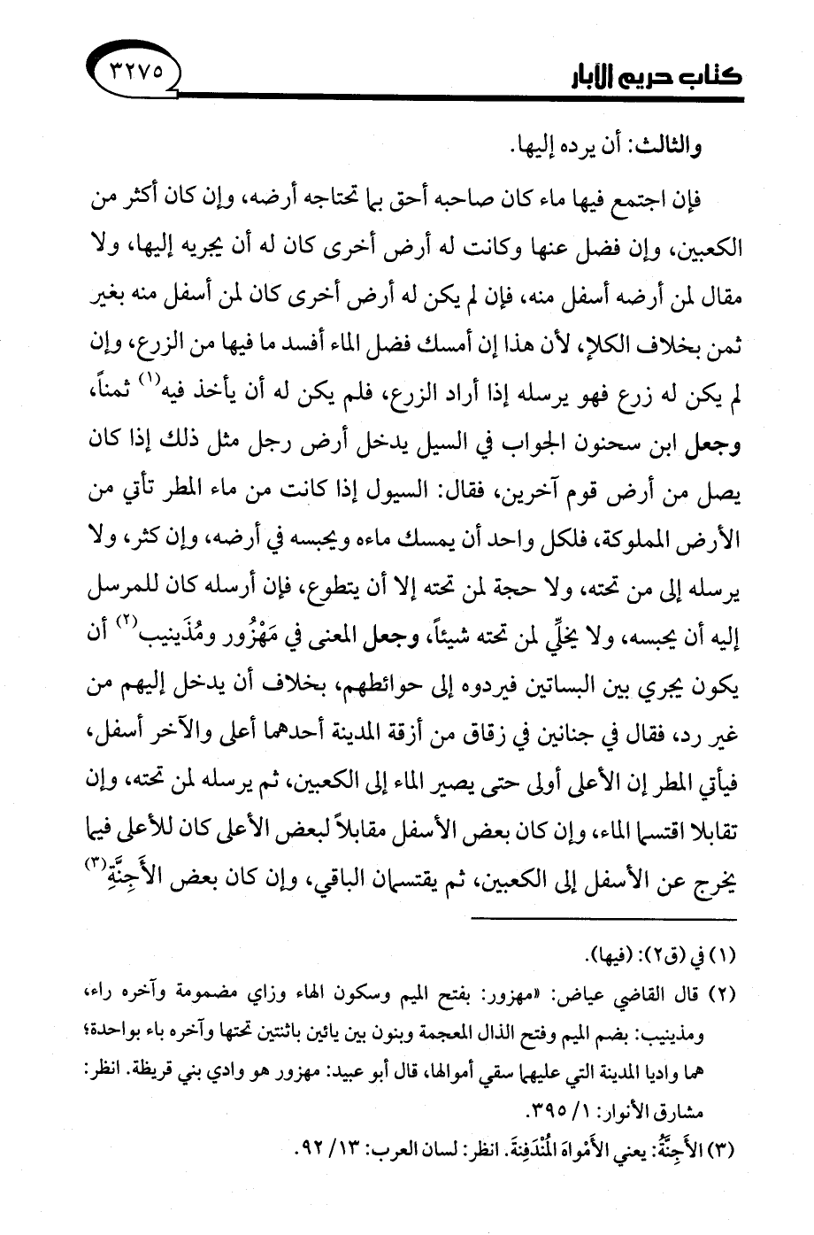 (¬2) قال القاضي عياض: "مهزور: بفتح الميم وسكون الهاء وزاي مضمومة وآخره راء، ومذينيب: بضم الميم وفتح الذال المعجمة وبنون بين يائين باثنتين تحتها وآخره باء بواحدة، هما واديا المدينة التي عليهما سقي أموالها، قال أبو عبيد: مهزور هو وادي بني قريظة. انظر: مشارق الأنوار: 1/ 395.