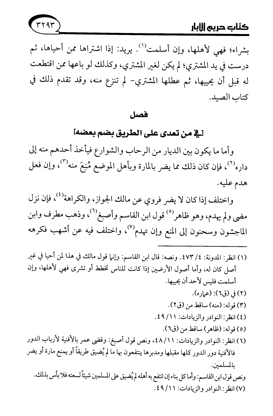 (¬6) انظر: النوادر والزيادات: 11/ 48، ونص قول أصبغ: وقضى عمر بالأفنية لأرباب الدور فالأفنية دور الدور كلها مقبلها ومدبرها ينتفعون جها ما لم يُضيق طريقًا أو يمنع مارة أو يضر بالمسلمين.