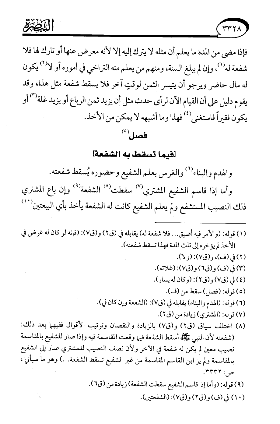 (¬8) اختلف سياق (ق 2) و (ق 7) بالزيادة والنقصان وترتيب الأقوال ففيهما بعد ذلك: (شفعته لأن النبي - صلى الله عليه وسلم - أسقط الشفعة فيما وقعت المقاسمة فيه وإذا صار للشفيع بالمقاسمة نصيب معين لم يكن له شفعة في الآخر ولأن نصف النصيب للمشتري صار إلى الشفيع بالمقاسمة ولم ير ابن القاسم المقاسمة من غير الشفيع تسقط الشفعة. . .) وهو ما سيأتي، ص: 3332.
