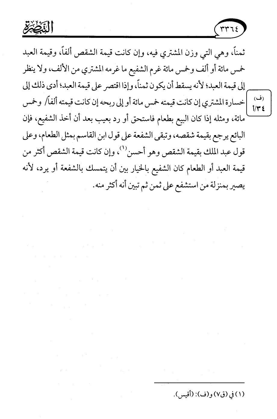 ثمنًا، وهي التي وزن المشتري فيه، وإن كانت قيمة الشقص ألفًا، وقيمة العبد خمس مائة أو ألف وخمس مائة غرم الشفيع ما غرمه المشتري من الألف، ولا ينظر إلى قيمة العبد؛ لأنه يسقط أن يكون ثمنًا، وإذا اقتصر على قيمة العبد، أدى ذلك إلى خسارة المشتري إن كانت قيمته خمس مائة أو إلى ربحه إن كانت قيمته ألفًا وخمس مائة، ومثله إذا كان البيع بطعام فاستحق أو رد بعيب بعد أن أخذ الشفيع، فإن البائع يرجع بقيمة شقصه، وتبقى الشفعة على قول ابن القاسم بمثل الطعام، وعلى قول عبد الملك بقيمة الشقص وهو أحسن (¬1)، وإن كانت قيمة الشقص أكثر من قيمة العبد أو الطعام كان الشفيع بالخيار بين أن يتمسك بالشفعة أو يرد؛ لأنه يصير بمنزلة من استشفع على ثمن ثم تبين أنه أكثر منه.