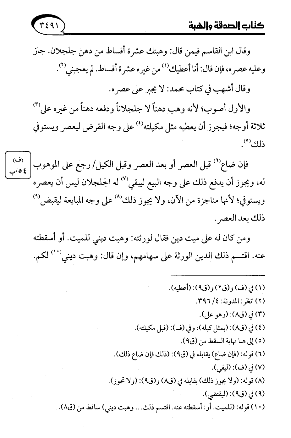 فإن ضاع (¬6) قبل العصر أو بعد العصر وقبل الكيل رجع على الموهوب له، ويجوز أن يدفع ذلك على وجه البيع ليبقي (¬7) له الجلجلان ليس أن يعصره ويستوفي؛ لأنها مناجزة من الآن، ولا يجوز ذلك (¬8) على وجه المبايعة ليقبض (¬9) ذلك بعد العصر.