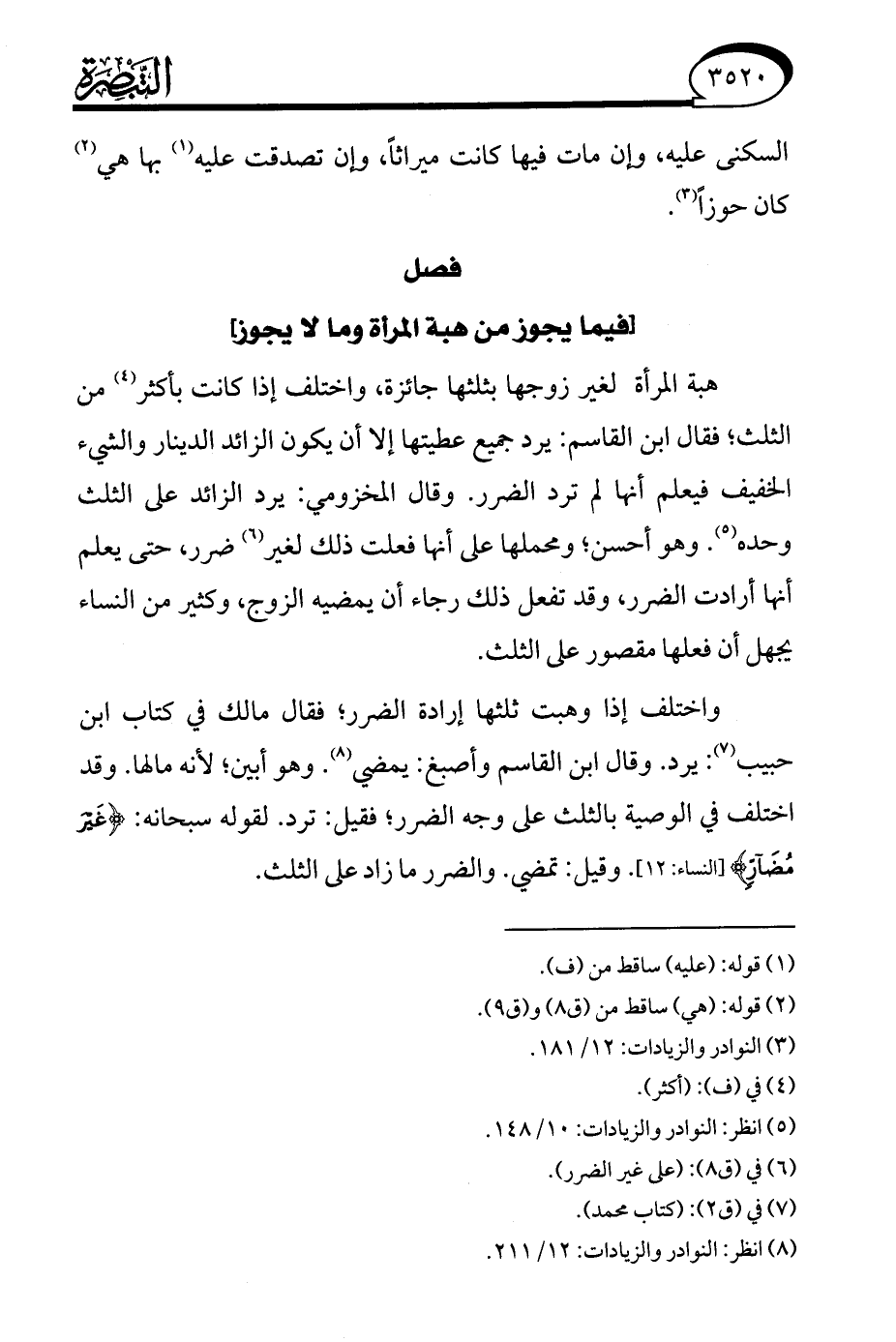 واختلف إذا وهبت ثلثها إرادة الضرر، فقال مالك في كتاب ابن حبيب (¬7): يرد. وقال ابن القاسم وأصبغ: يمضي (¬8). وهو أبين؛ لأنه مالها. وقد اختلف في الوصية بالثلث على وجه الضرر، فقيل: ترد. لقوله سبحانه: {غَيْرَ مُضَارٍّ} [النساء: 12]. وقيل: تمضي. والضرر ما زاد على الثلث.