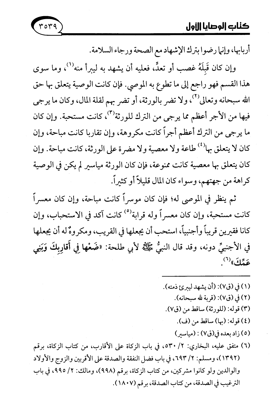 وإن كان قَبِلَهُ غصب أو تعدٍّ، فعليه أن يشهد به ليبرأ منه (¬1)، وما سوى هذا القسم فهو راجع إلى ما تطوع به الموصي. فإن كانت الوصية يتعلق بها حق الله سبحانه وتعالى (¬2)، ولا تضر بالورثة، أو تضر بهم لقلة المال، وكان ما يرجى فيها من الأجر أعظم مما يرجى من الترك للورثة (¬3)، كانت مستحبة. وإن كان ما يرجى من الترك أعظم أجرًا كانت مكروهة، وإن تقاربا كانت مباحة، وإن كان لا يتعلق بها (¬4) طاعة ولا معصية ولا مضرة على الورثة، كانت مباحة. وإن كان يتعلق بها معصية كانت ممنوعة، فإن كان الورثة مياسير لم يكن في الوصية كراهة من جهتهم، وسواء كان المال قليلًا أو كثيرًا.