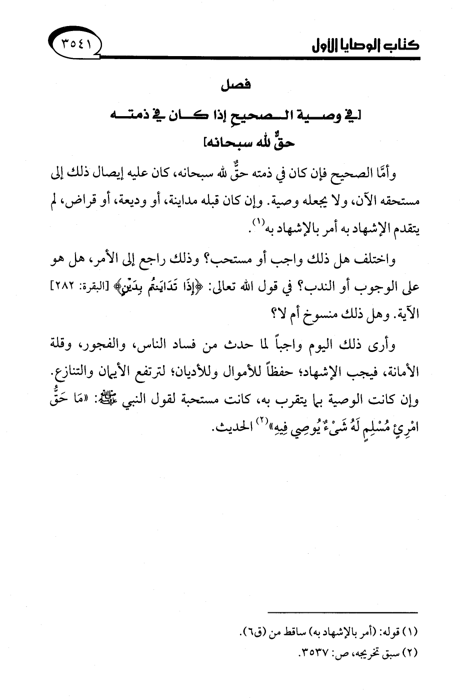وأرى ذلك اليوم واجبًا لما حدث من فساد الناس، والفجور، وقلة الأمانة، فيجب الإشهاد؛ حفظًا للأموال وللأديان، لترتفع الأيمان والتنازع. وإن كانت الوصية بما يتقرب به، كانت مستحبة لقول النبي - صلى الله عليه وسلم -: "مَا حَقُّ امْرِئٍ مُسْلِمٍ لَهُ شَىْءٌ يُوصِي فِيهِ" (¬2) الحديث.