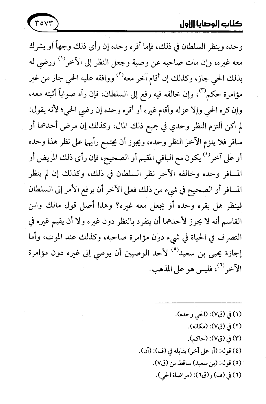 وحده وينظر السلطان في ذلك، فإما أقره وحده إن رأى ذلك وجهًا أو يشرك معه غيره، وإن مات صاحبه عن وصية وجعل النظر إلى الآخر (¬1) ورضي له بذلك الحي جاز، وكذلك إن أقام آخر معه (¬2) ووافقه عليه الحي جاز من غير مؤامرة حكم (¬3)، وإن خالفه فيه رفع إلى السلطان، فإن رآه صوابًا أثبته معه، وإن كره الحي وإلا عزله وأقام غيره أو أقره وحده إن رضي الحي؛ لأنه يقول: لم أكن ألتزم النظر وحدي في جميع ذلك المال، وكذلك إن مرض أحدهما أو سافر فلا يلزم الآخر النظر وحده، ويجوز أن يجتمع رأيهما على نظر هذا وحده أو على آخر (¬4) يكون مع الباقي المقيم أو الصحيح، فإن رأى ذلك المريض أو المسافر وحده وخالفه الآخر نظر السلطان في ذلك، وكذلك إن لم ينظر المسافر أو الصحيح في شيء من ذلك فعلى الآخر أن يرفع الأمر إلى السلطان فينظر هل يقره وحده أو يجعل معه غيره؟ وهذا أصل قول مالك وابن القاسم أنه لا يجوز لأحدهما أن ينفرد بالنظر دون غيره ولا أن يقيم غيره في التصرف في الحياة في شيء دون مؤامرة صاحبه، وكذلك عند الموت، وأما إجازة يحيى بن سعيد (¬5) لأحد الوصيين أن يوصي إلى غيره دون مؤامرة الآخر (¬6)، فليس هو على المذهب.