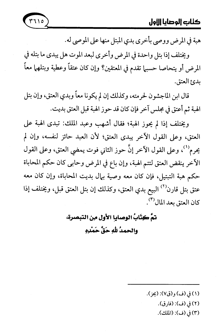تمَّ كِتَابُ الوصايا الأول مِن التبصرة, والحمدُ للهِ حَقَّ حَمْدِهِ