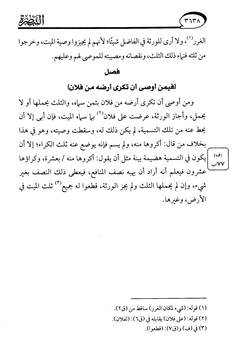 الغرر (¬1)، ولا أرى للورثة في الفاضل شيئًا؛ لأنهم لم يجيزوا وصية الميت، وخرجوا من ثلثه فنماء ذلك الثلث، ونقصانه ومصيبته للموصى لهم وعليهم.