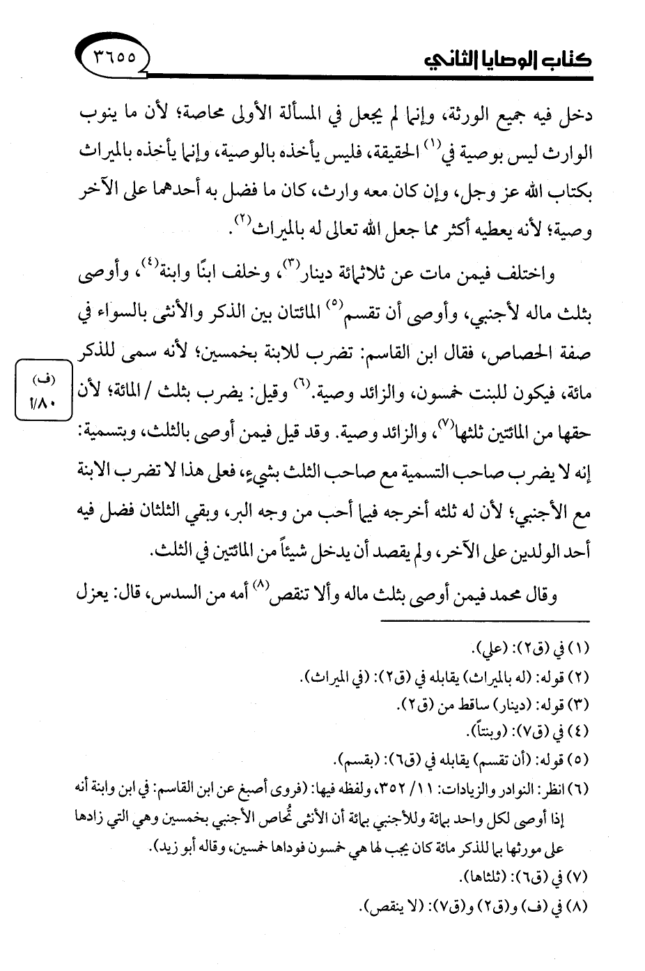 (¬6) انظر: النوادر والزيادات: 11/ 352، ولفظه فيها: (فروى أصبغ عن ابن القاسم: في ابن وابنة أنه إذا أوصى لكل واحد بمائة وللأجنبي بمائة أن الأنثى تُحاص الأجنبي بخمسين وهي التي زادها على مورثها بما للذكر مائة كان يجب لها هي خمسون فوداها خمسين، وقاله أبو زيد).