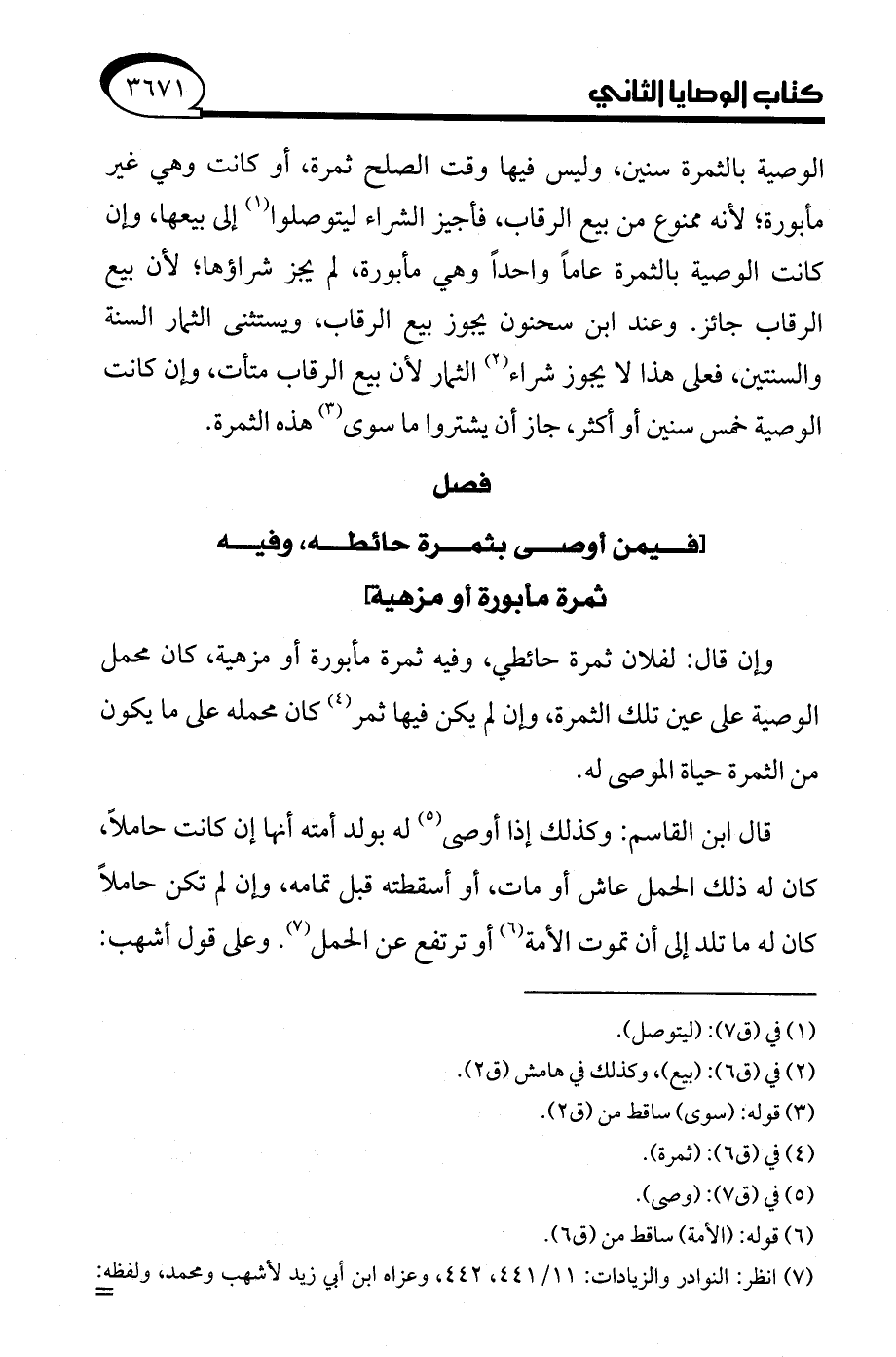 الوصية بالثمرة سنين، وليس فيها وقت الصلح ثمرة، أو كانت وهي غير مأبورة؛ لأنه ممنوع من بيع الرقاب، فأجيز الشراء ليتوصلوا (¬1) إلى بيعها، وإن كانت الوصية بالثمرة عامًا واحدًا وهي مأبورة، لم يجز شراؤها؛ لأن بيع الرقاب جائز. وعند ابن سحنون يجوز بيع الرقاب، ويستثنى الثمار السنة والسنتين، فعلى هذا لا يجوز شراء (¬2) الثمار لأن بيع الرقاب متأت، وإن كانت الوصية خمس سنين أو أكثر، جاز أن يشتروا ما سوى (¬3) هذه الثمرة.