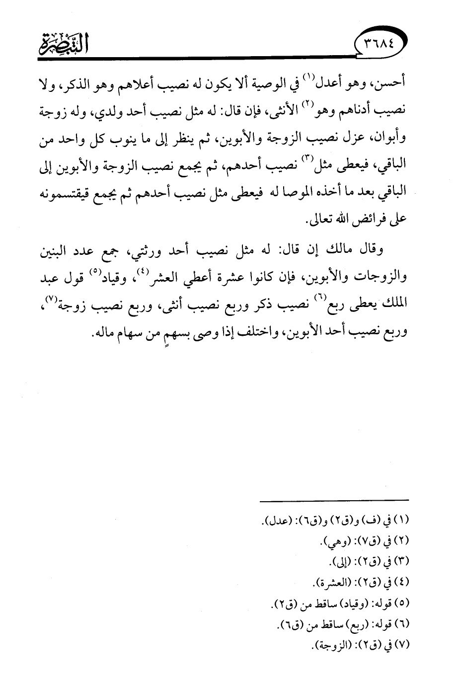 وقال مالك إن قال: له مثل نصيب أحد ورثتي، جمع عدد البنين والزوجات والأبوين، فإن كانوا عشرة أعطي العشر (¬4)، وقياد (¬5) قول عبد الملك يعطى ربع (¬6) نصيب ذكر وربع نصيب أنثى، وربع نصيب زوجة (¬7)، وربع نصيب أحد الأبوين، واختلف إذا وصى بسهمٍ من سهام ماله.