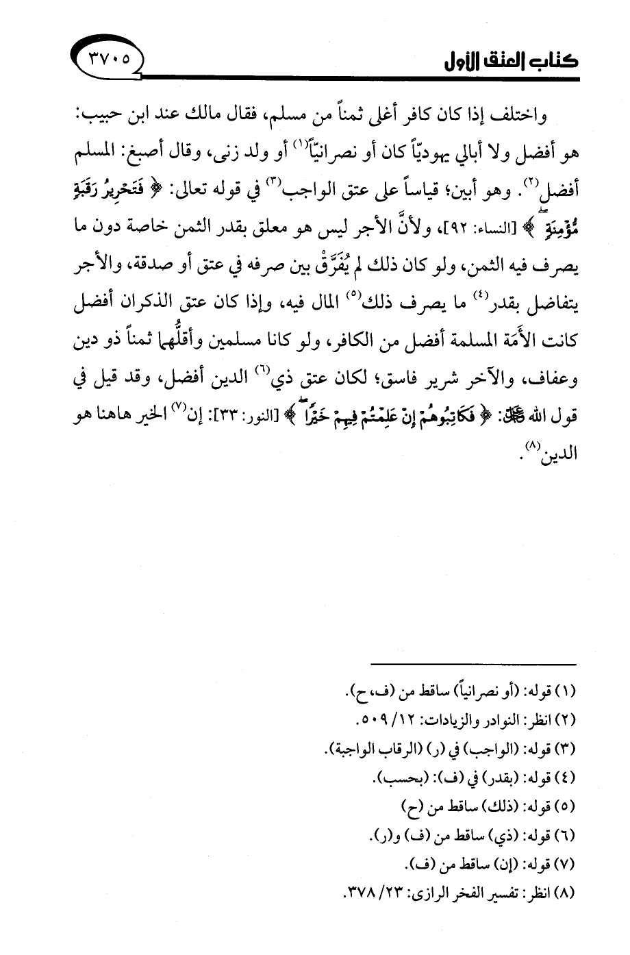 واختلف إذا كان كافر أغلى ثمنًا من مسلم، فقال مالك عند ابن حبيب: هو أفضل ولا أبالي يهوديًّا كان أو نصرانيًّا (¬1) أو ولد زنى، وقال أصبغ: المسلم أفضل (¬2). وهو أبين، قياسًا على عتق الواجب (¬3) في قوله تعالى: {فَتَحْرِيرُ رَقَبَةٍ مُؤْمِنَةٍ} [النساء: 92]، ولأنَّ الأجر ليس هو معلق بقدر الثمن خاصة دون ما يصرف فيه الثمن، ولو كان ذلك لم يُفَرَّقْ بين صرفه في عتق أو صدقة، والأجر يتفاضل بقدر (¬4) ما يصرف ذلك (¬5) المال فيه، وإذا كان عتق الذكران أفضل كانت الأَمَة المسلمة أفضل من الكافر، ولو كانا مسلمين وأقلُّهما ثمنًا ذو دين وعفاف، والآخر شرير فاسق، لكان عتق ذي (¬6) الدين أفضل، وقد قيل في قول الله -عز وجل-: {فَكَاتِبُوهُمْ إِنْ عَلِمْتُمْ فِيهِمْ خَيْرًا} [النور: 33]: إن (¬7) الخير ها هنا هو الدين (¬8).