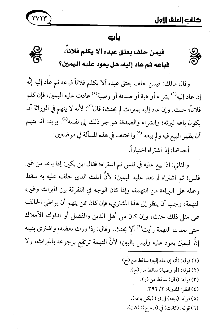 والثاني: إذا بيع عليه في فلس ثم اشتراه، فقال ابن بكير: إذا باعه من غير فلس، ثم اشتراه لم تعد عليه اليمين؛ لأنَّ الملك الذي حلف عليه به سقط وحمله على البراءة من التهمة، وإذا كان الوجه في التفرقة بين الميراث وغيره التهمة، وجب أن ينظر إلى هذا المشتري، فإن كان ممن يتهم أن يواطئ الحالف على مثل ذلك حنث، وإن كان من أهل الدين والفضل أو تداولته الأملاك حتى بعدت التهمة رأيت (¬6) ألا يحنث. وقال: إذا ورث بعضه، واشترى بقيته إنَّ اليمين يعود عليه وليس بالبين؛ لأنَّ التهمة ترتفع برجوعه بالميراث، ولا