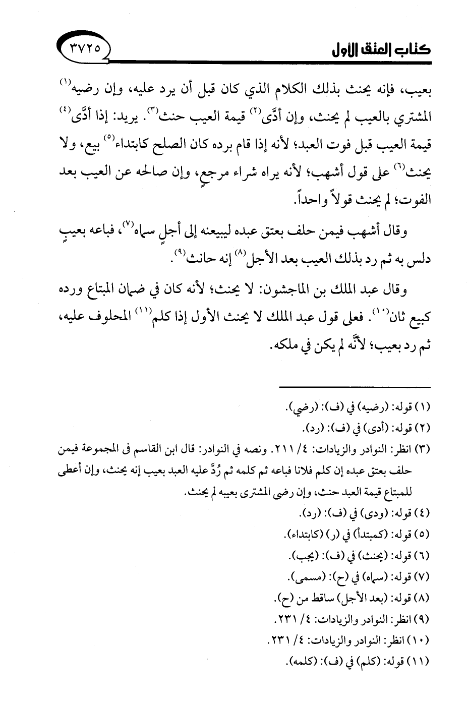 (¬3) انظر: النوادر والزيادات: 4/ 211. ونصه في النوادر: قال ابن القاسم فى المجموعة فيمن حلف بعتق عبده إن كلم فلانا فباعه ثم كلمه ثم رُدَّ عليه العبد بعيب إنه يحنث، وإن أعطى للمبتاع قيمة العبد حنث، وإن رضى المشتري بعيبه لم يحنث.