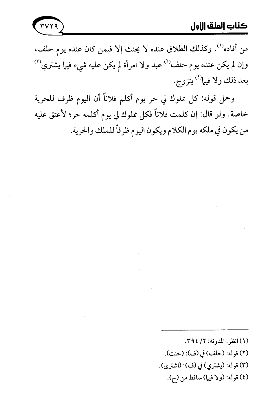 وحمل قوله: كل مملوك لي حر يوم أكلم فلانًا أن اليوم ظرف للحرية خاصة. ولو قال: إن كلمت فلانًا فكل مملوك في يوم أكلمه حر، لأعتق عليه من يكون في ملكه يوم الكلام ويكون اليوم ظرفًا للملك والحرية.
