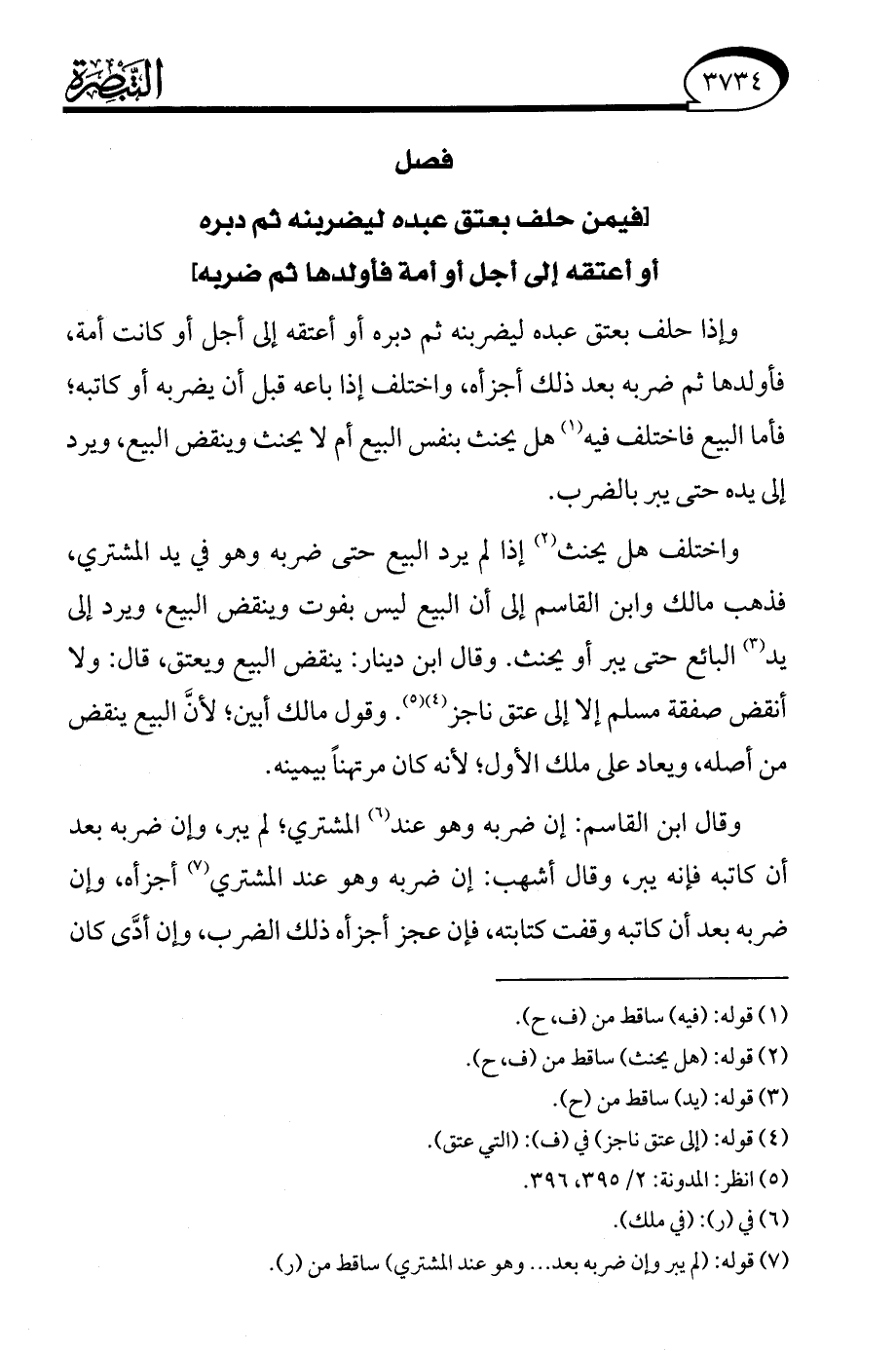 واختلف هل يحنث (¬2) إذا لم يرد البيع حتى ضربه وهو في يد المشتري، فذهب مالك وابن القاسم إلى أن البيع ليس بفوت وينقض البيع، ويرد إلى يد (¬3) البائع حتى يبر أو يحنث. وقال ابن دينار: ينقض البيع ويعتق، قال: ولا أنقض صفقة مسلم إلا إلى عتق ناجز (¬4) (¬5). وقول مالك أبين؛ لأنَّ البيع ينقض من أصله، ويعاد على ملك الأول؛ لأنه كان مرتهنًا بيمينه.
