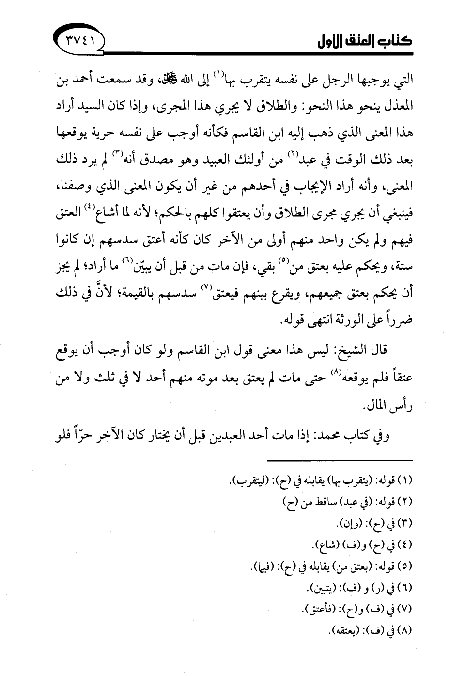 التي يوجبها الرجل على نفسه يتقرب بها (¬1) إلى الله -عز وجل-، وقد سمعت أحمد بن المعذل ينحو هذا النحو: والطلاق لا يجري هذا المجرى، وإذا كان السيد أراد هذا المعنى الذي ذهب إليه ابن القاسم فكأنه أوجب على نفسه حرية يوقعها بعد ذلك الوقت في عبد (¬2) من أولئك العبيد وهو مصدق أنه (¬3) لم يرد ذلك المعنى، وأنه أراد الإيجاب في أحدهم من غير أن يكون المعنى الذي وصفنا، فينبغي أن يجري مجرى الطلاق وأن يعتقوا كلهم بالحكم؛ لأنه لما أشاع (¬4) العتق فيهم ولم يكن واحد منهم أولى من الآخر كان كأنه أعتق سدسهم إن كانوا ستة، ويحكم عليه بعتق من (¬5) بقي، فإن مات من قبل أن يبّين (¬6) ما أراد، لم يجز أن يحكم بعتق جميعهم، ويقرع بينهم فيعتق (¬7) سدسهم بالقيمة؛ لأنَّ في ذلك ضررًا على الورثة انتهى قوله.