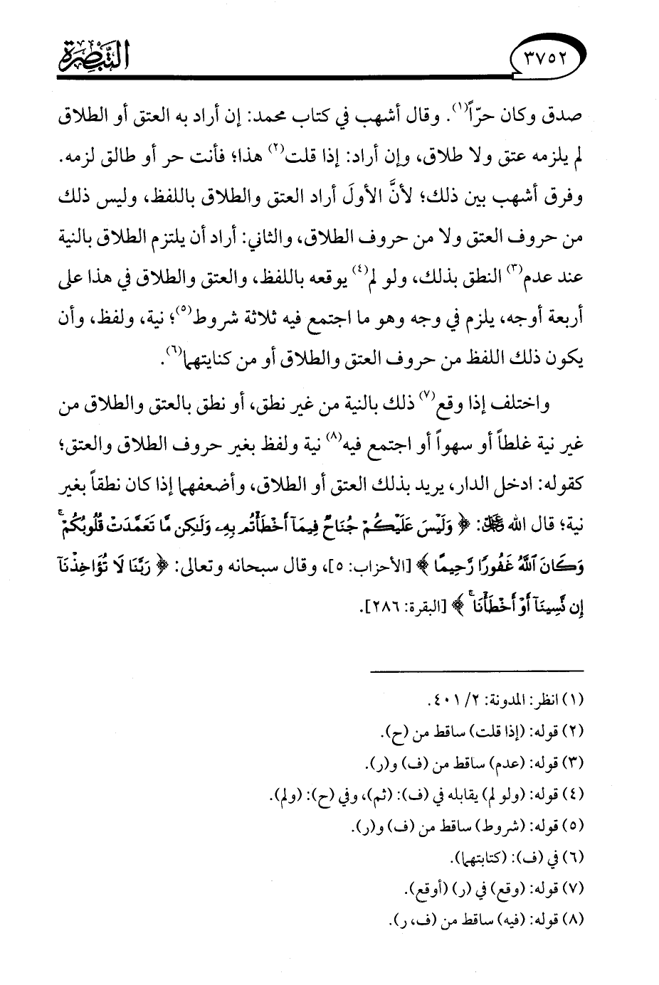 واختلف إذا وقع (¬7) ذلك بالنية من غير نطق، أو نطق بالعتق والطلاق من غير نية غلطًا أو سهوًا أو اجتمع فيه (¬8) نية ولفظ بغير حروف الطلاق والعتق، كقوله: ادخل الدار، يريد بذلك العتق أو الطلاق، وأضعفهما إذا كان نطقًا بغير نية، قال الله -عز وجل-: {وَلَيْسَ عَلَيْكُمْ جُنَاحٌ فِيمَا أَخْطَأْتُمْ بِهِ وَلَكِنْ مَا تَعَمَّدَتْ قُلُوبُكُمْ وَكَانَ اللَّهُ غَفُورًا رَحِيمًا} [الأحزاب: 5]، وقال سبحانه وتعالى: {رَبَّنَا لَا تُؤَاخِذْنَا إِنْ نَسِينَا أَوْ أَخْطَأْنَا} [البقرة: 286].