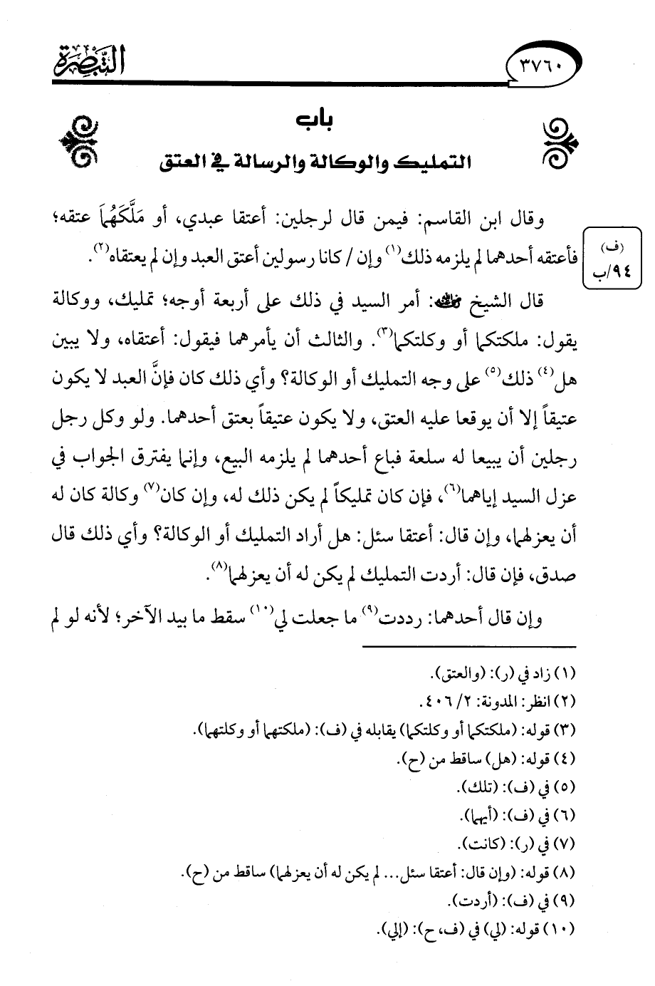 قال الشيخ - رضي الله عنه -: أمر السيد في ذلك على أربعة أوجه، تمليك، ووكالة يقول: ملكتكما أو وكلتكما (¬3). والثالث أن يأمرهما فيقول: أعتقاه، ولا يبين هل (¬4) ذلك (¬5) على وجه التمليك أو الوكالة؟ وأي ذلك كان فإنَّ العبد لا يكون عتيقًا إلا أن يوقعا عليه العتق، ولا يكون عتيقًا بعتق أحدهما. ولو وكل رجل رجلين أن يبيعا له سلعة فباع أحدهما لم يلزمه البيع، وإنما يفترق الجواب في عزل السيد إياهما (¬6)، فإن كان تمليكًا لم يكن ذلك له، وإن كان (¬7) وكالة كان له أن يعزلهما، وإن قال: أعتقا سئل: هل أراد التمليك أو الوكالة؟ وأي ذلك قال صدق، فإن قال: أردت التمليك لم يكن له أن يعزلهما (¬8).