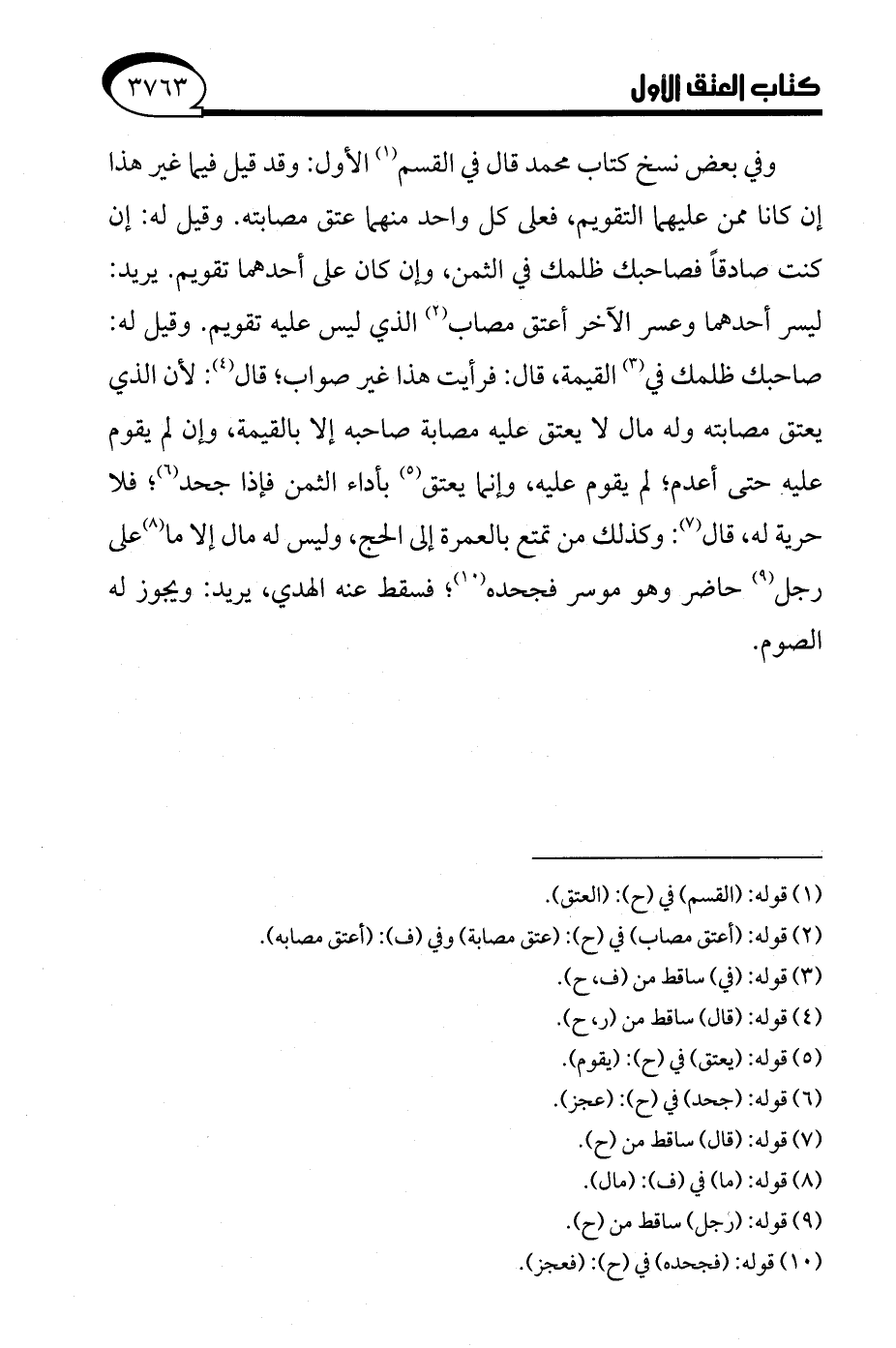 وفي بعض نسخ كتاب محمد قال في القسم (¬1) الأول: وقد قيل فيما غير هذا إن كانا ممن عليهما التقويم، فعلى كل واحد منهما عتق مصابته. وقيل له: إن كنت صادقًا فصاحبك ظلمك في الثمن، وإن كان على أحدهما تقويم. يريد: ليسر أحدهما وعسر الآخر أعتق مصاب (¬2) الذي ليس عليه تقويم. وقيل له: صاحبك ظلمك في (¬3) القيمة، قال: فرأيت هذا غير صواب، قال (¬4): لأن الذي يعتق مصابته وله مال لا يعتق عليه مصابة صاحبه إلا بالقيمة، وإن لم يقوم عليه. حتى أعدم، لم يقوم عليه، وإنما يعتق (¬5) بأداء الثمن فإذا جحد (¬6)؛ فلا حرية له، قال (¬7): وكذلك من تمتع بالعمرة إلى الحج، وليس له مال إلا ما (¬8) على رجل (¬9) حاضر وهو موسر فجحده (¬10)، فسقط عنه الهدي، يريد: ويجوز له الصوم.