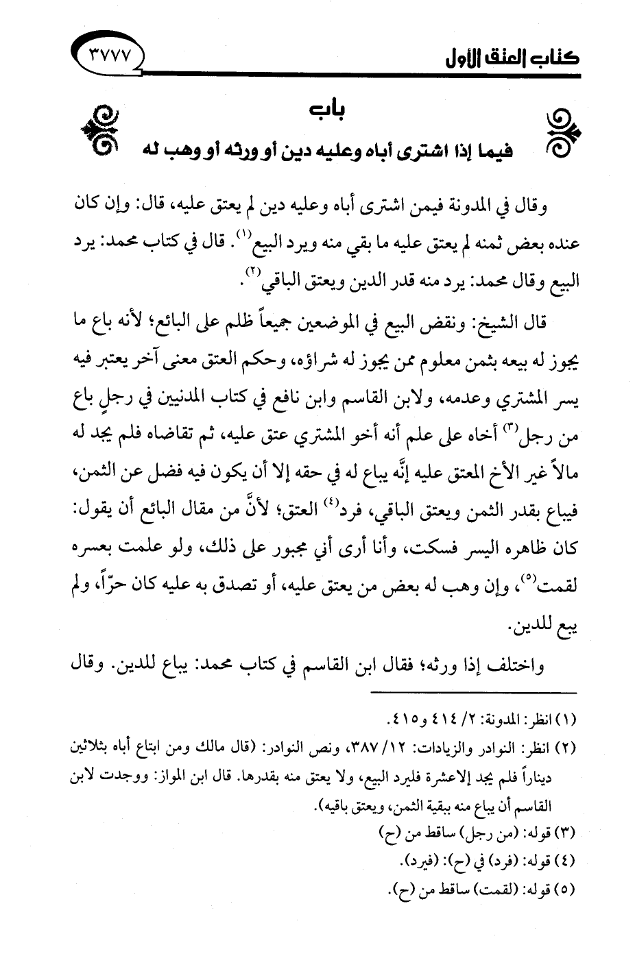 (¬2) انظر: النوادر والزيادات: 12/ 387، ونص النوادر: (قال مالك ومن ابتاع أباه بثلاثين دينارًا فلم يجد إلا عشرة فليرد البيع، ولا يعتق منه بقدرها. قال ابن المواز: ووجدت لابن القاسم أن يباع منه ببقية الثمن، ويعتق باقيه).