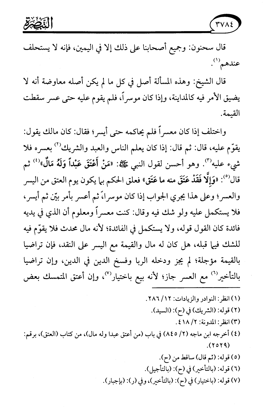 واختلف إذا كان معسرًا فلم يحاكمه حتى أيسر، فقال: كان مالك يقول: يقوّم عليه، قال: ثم قال: إذا كان يعلم الناس والعبد والشريك (¬2) بعسره فلا شيء عليه (¬3). وهو أحسن لقول النبي - صلى الله عليه وسلم -: "مَنْ أَعْتَقَ عَبْدًا وَلَهُ مَالٌ" (¬4) ثم قال (¬5): "وَإِلَّا فَقَدْ عَتَقَ منه ما عَتَق" فعلق الحكم بما يكون يوم العتق من اليسر والعسر، وعلى هذا يجري الجواب إذا كان موسرًا، ثم أعسر بأمر بّين ثم أيسر، فلا يستكمل عليه ولو شك فيه وقال: كنت معسرًا ومعلوم أن الذي في يديه فائدة كان القول قوله، ولا يستكمل في الفائدة؛ لأنه مال محدث فلا يقوّم فيه للشك فيما قبله، هل كان له مال والقيمة مع اليسر على النقد، فإن تراضيا بالقيمة مؤجلة، لم يجز ودخله الربا وفسخ الدين في الدين، وإن تراضيا بالتأخير (¬6) مع العسر جاز؛ لأنه بيع باختيار (¬7)، وإن أعتق المتمسك بعض